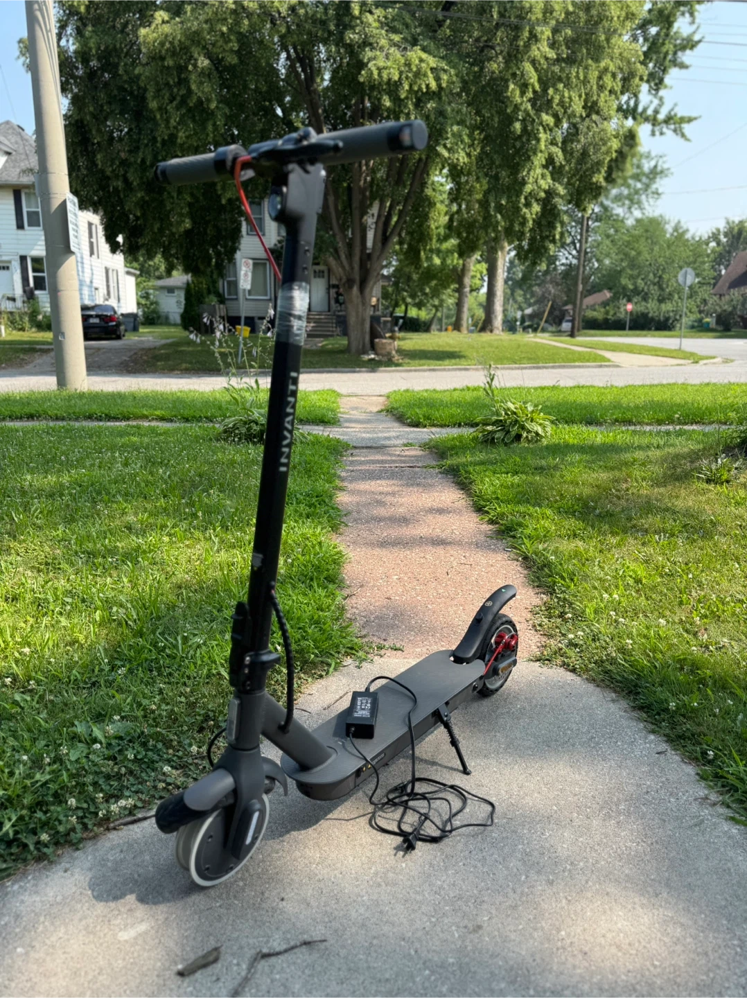 INVANTI E30 Electric Scooter – As-Is (Needs Front Fork & Tire Repair) Selling my INVANTI E30 e-scooter. It was used regularly for short commutes and worked well. The front fork got bent and the front tire came out, so it now needs repair before riding again. ✅ What’s Working: – Battery charges normally – Range up to ~25 km depending on mode and rider weight – Electronic lock, turn signals, and disc brakes all functional – Rear suspension and rear tire are in good shape – Comes with original charger ❗Needs attention: – Front fork is bent – Front tire detached and needs repair or replacement – Not rideable in current condition Paid $350 CAD. Selling as-is for repair or parts. Ideal for someone who can fix scooters or wants to use components like motor, battery, or electronics. 💰 Asking $135 OBO – open to offers.