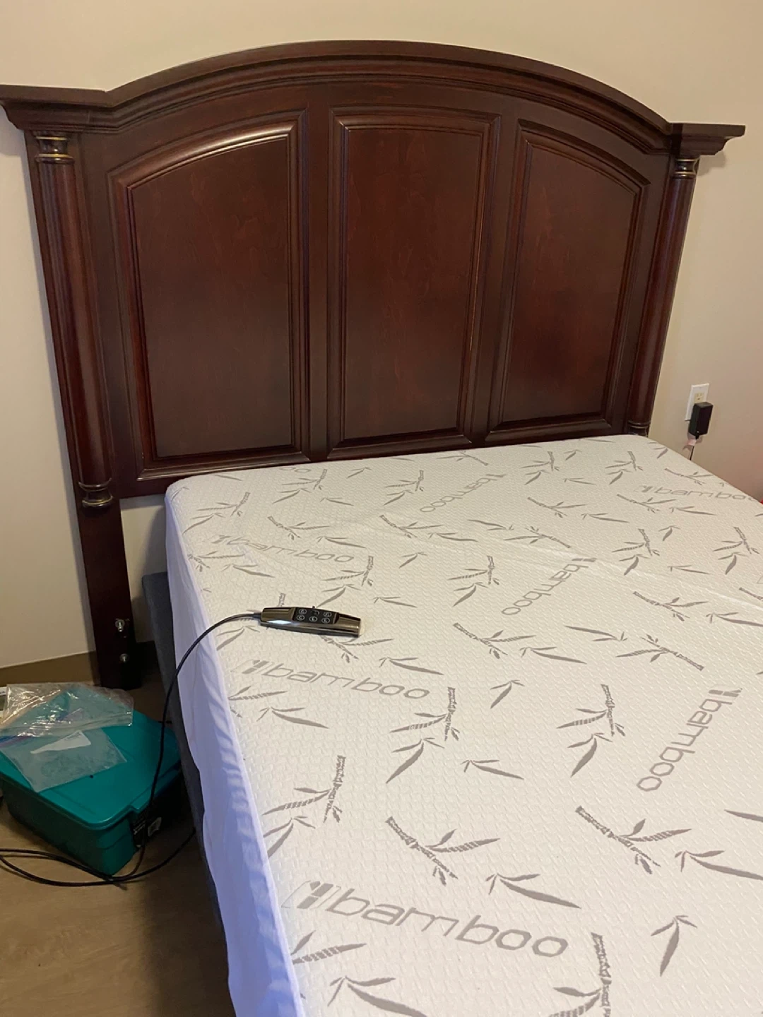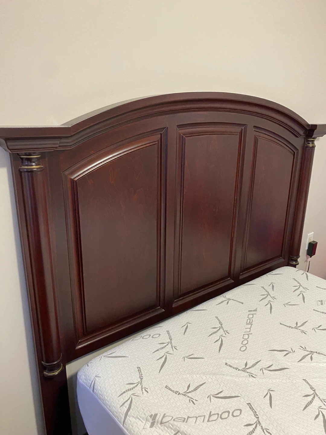 Cherry colour solid wood Queen size headboard with a classic arched design. It features decorative wood panels and trim. The headboard is designed to attach to a bed frame and is suitable for a queen or double sized mattress. Moving contents sale.