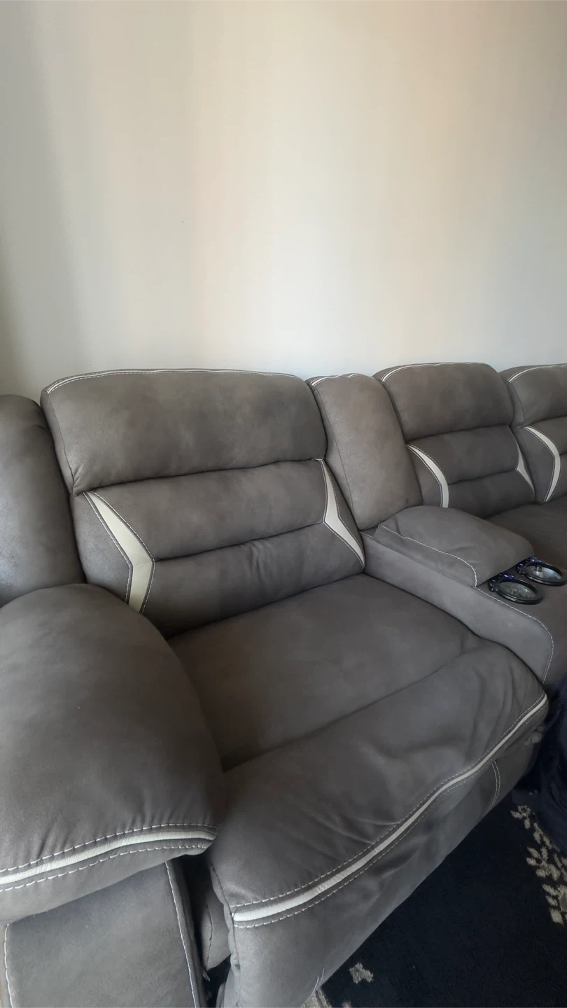 Selling a comfortable gray reclining sectional sofa. It features a modern design with white accents and built-in cup holders. Perfect for a living room or home theater setup!
