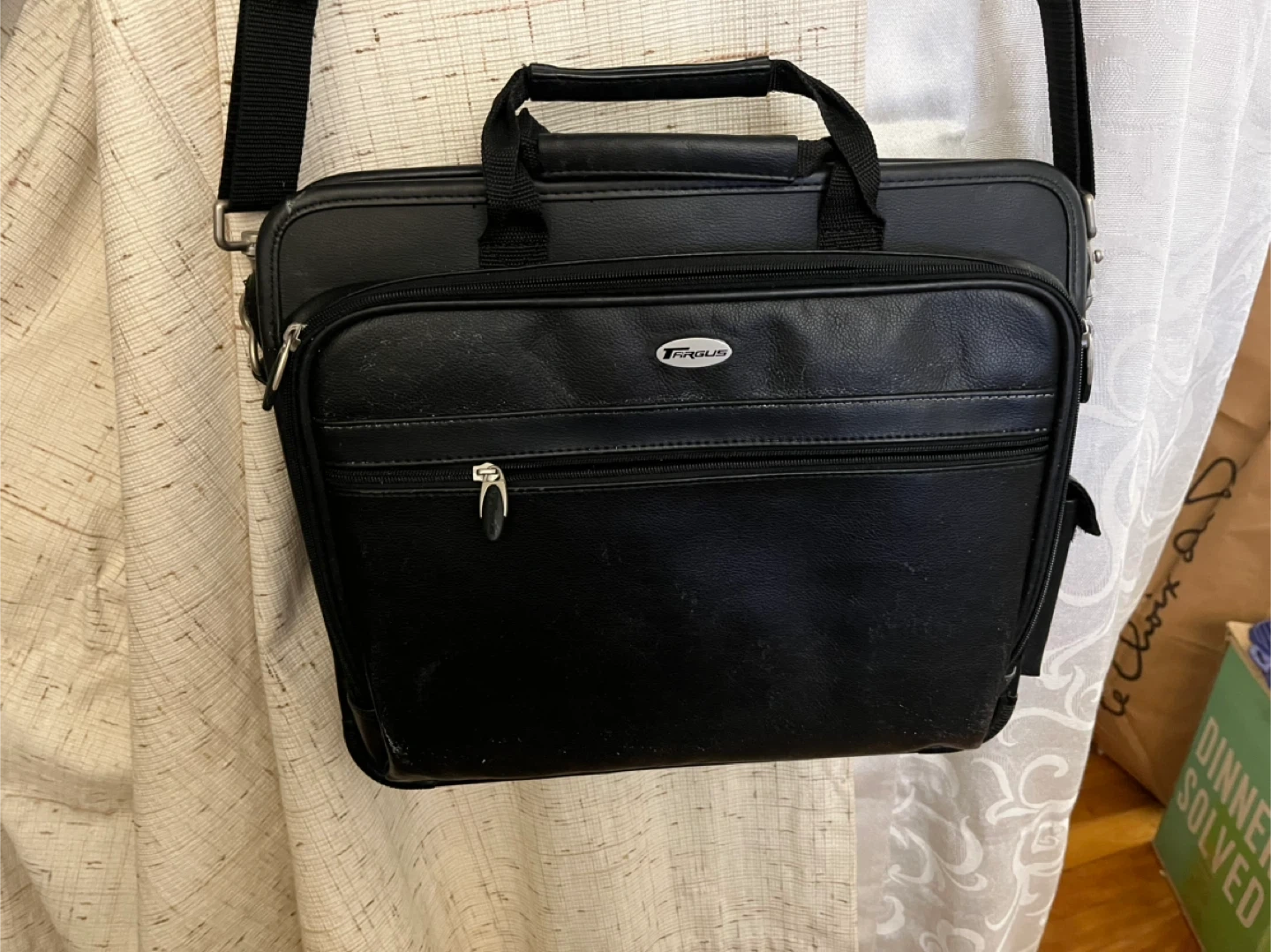 This Targus laptop bag is black with a faux leather exterior. It features multiple compartments inside and outside for organization. It's great for carrying your laptop and work essentials on the go!
