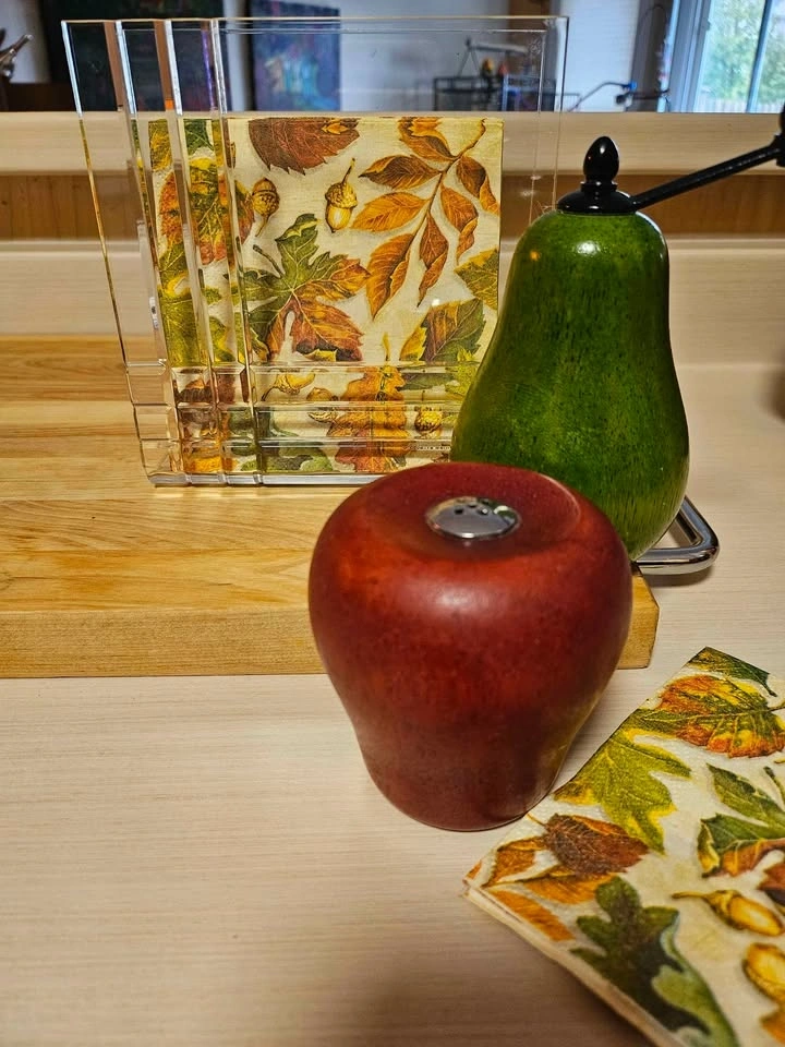 This clear lucite napkin holder from the 70s or 80s features an etched cross pattern. It's perfect for any occasion, as seeing the napkins inside helps set the mood for your gathering. This is a versatile piece that fits any decor style. Dimensions are 6" high x 5 3/4" wide x 2 1/2" at its deepest point. There are minor scratches consistent with age, but they don't detract from its appearance. The wood apple salt shaker and pear pepper grinder are being sold separately.