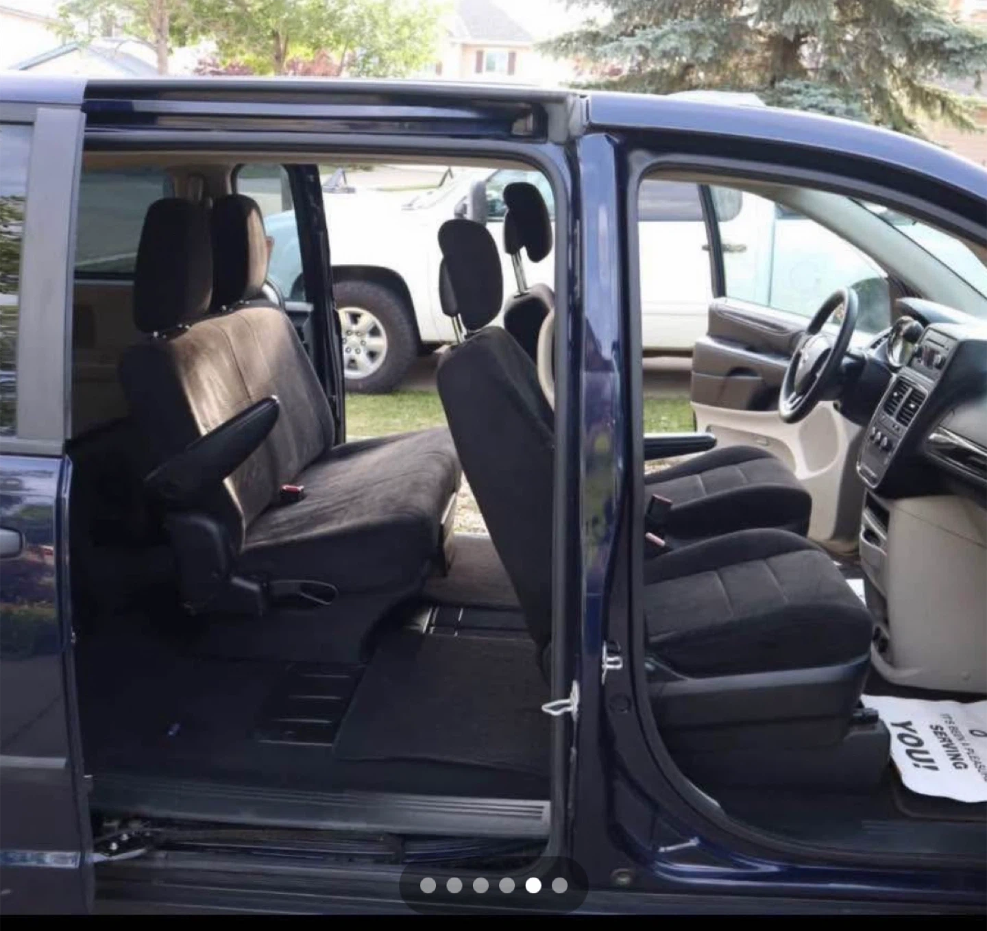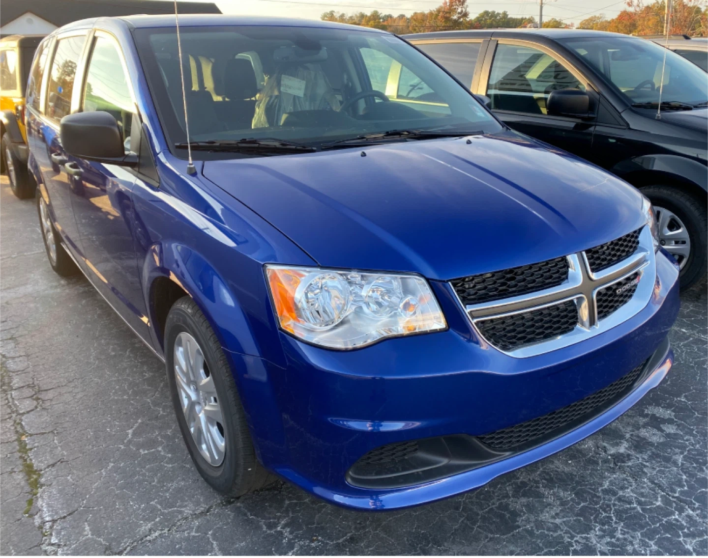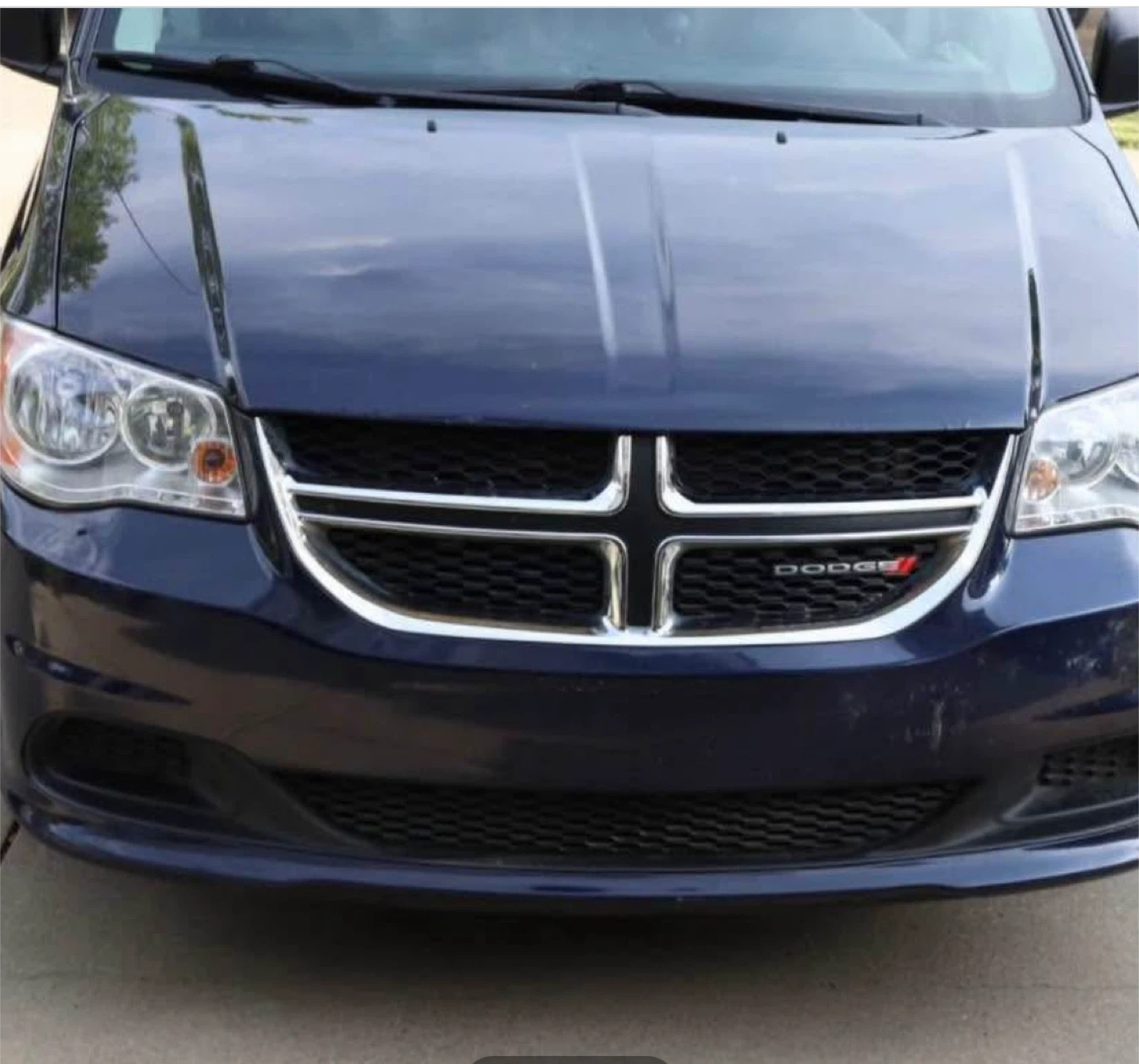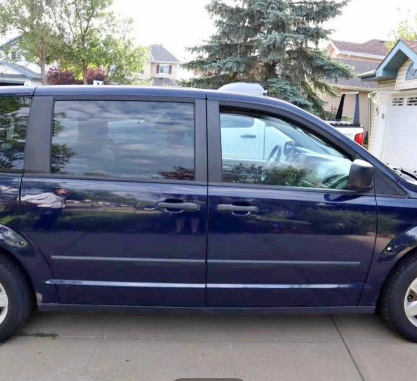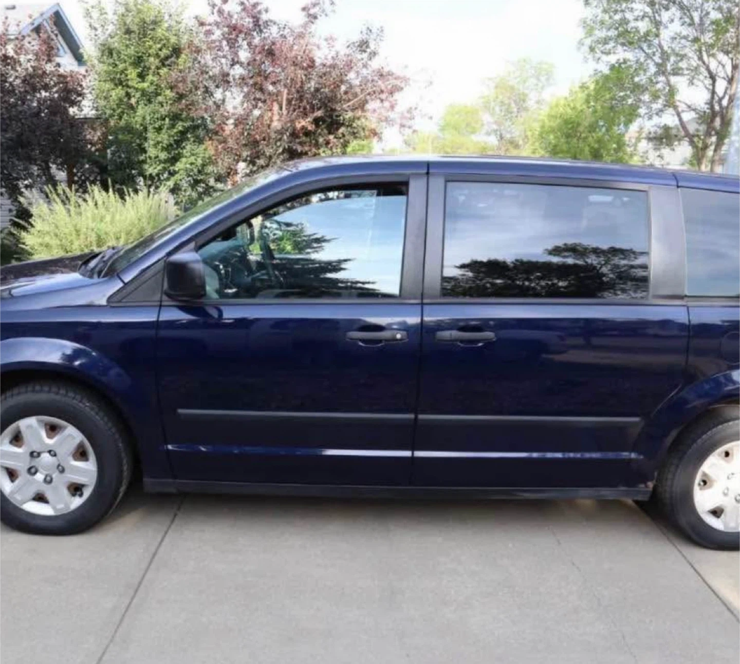 This is a Dodge Grand Caravan minivan in a deep blue colour. It's a spacious vehicle with comfortable seating for passengers. Great for family trips or hauling gear!