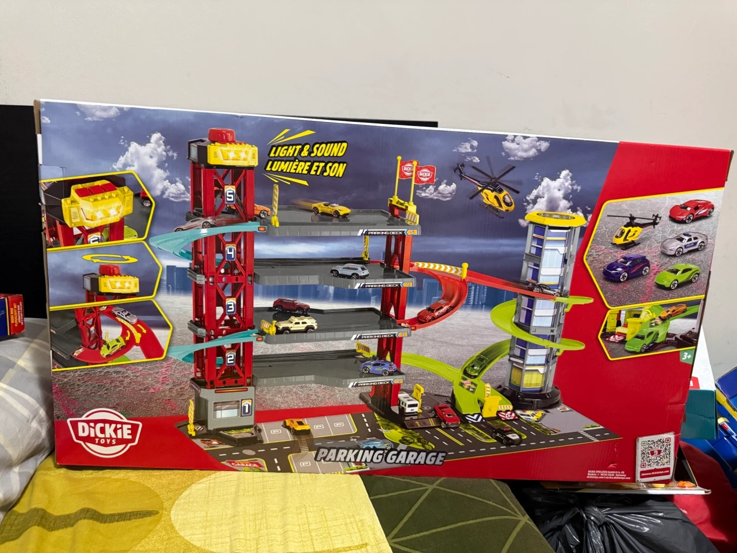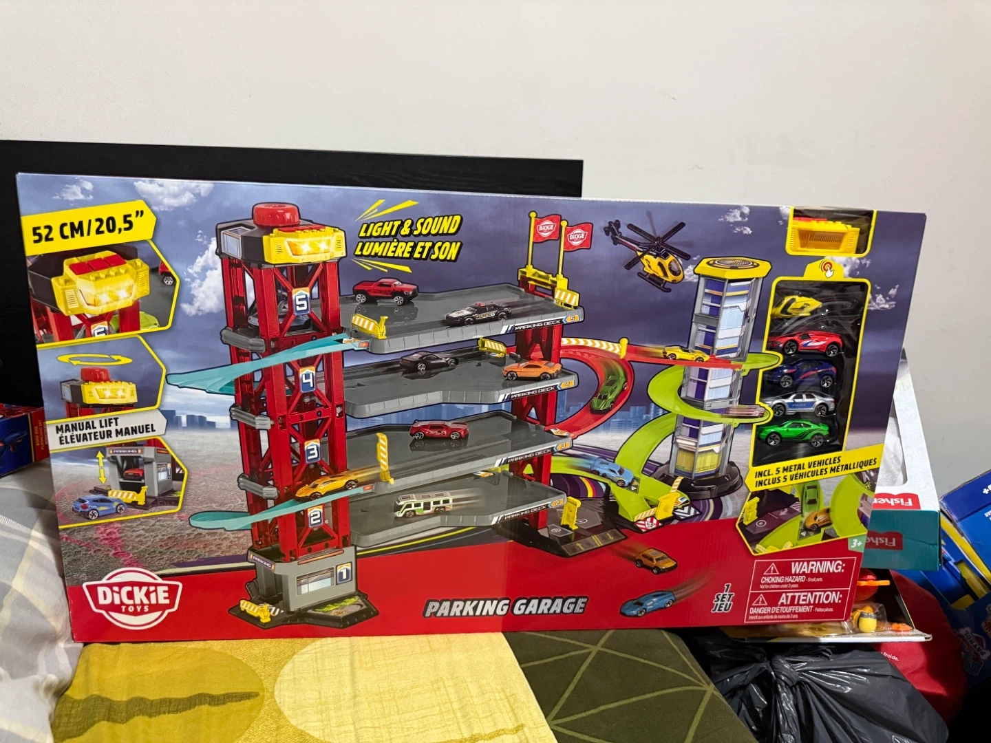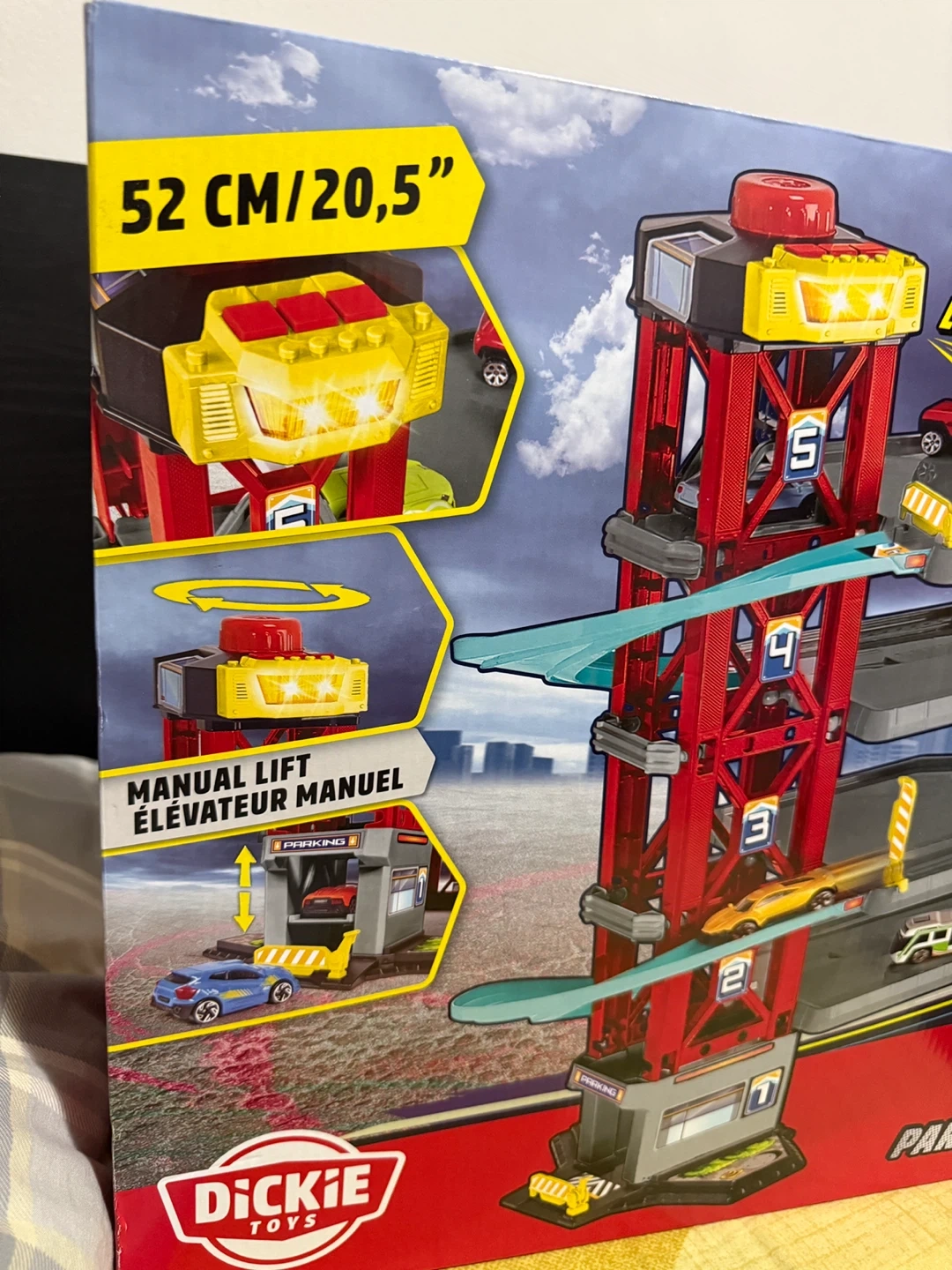 This Dickie Toys parking garage playset features a manual lift and light & sound functions. It's 52 cm / 20.5 inches tall and includes 5 metal vehicles. Comes in original packaging with accessories.