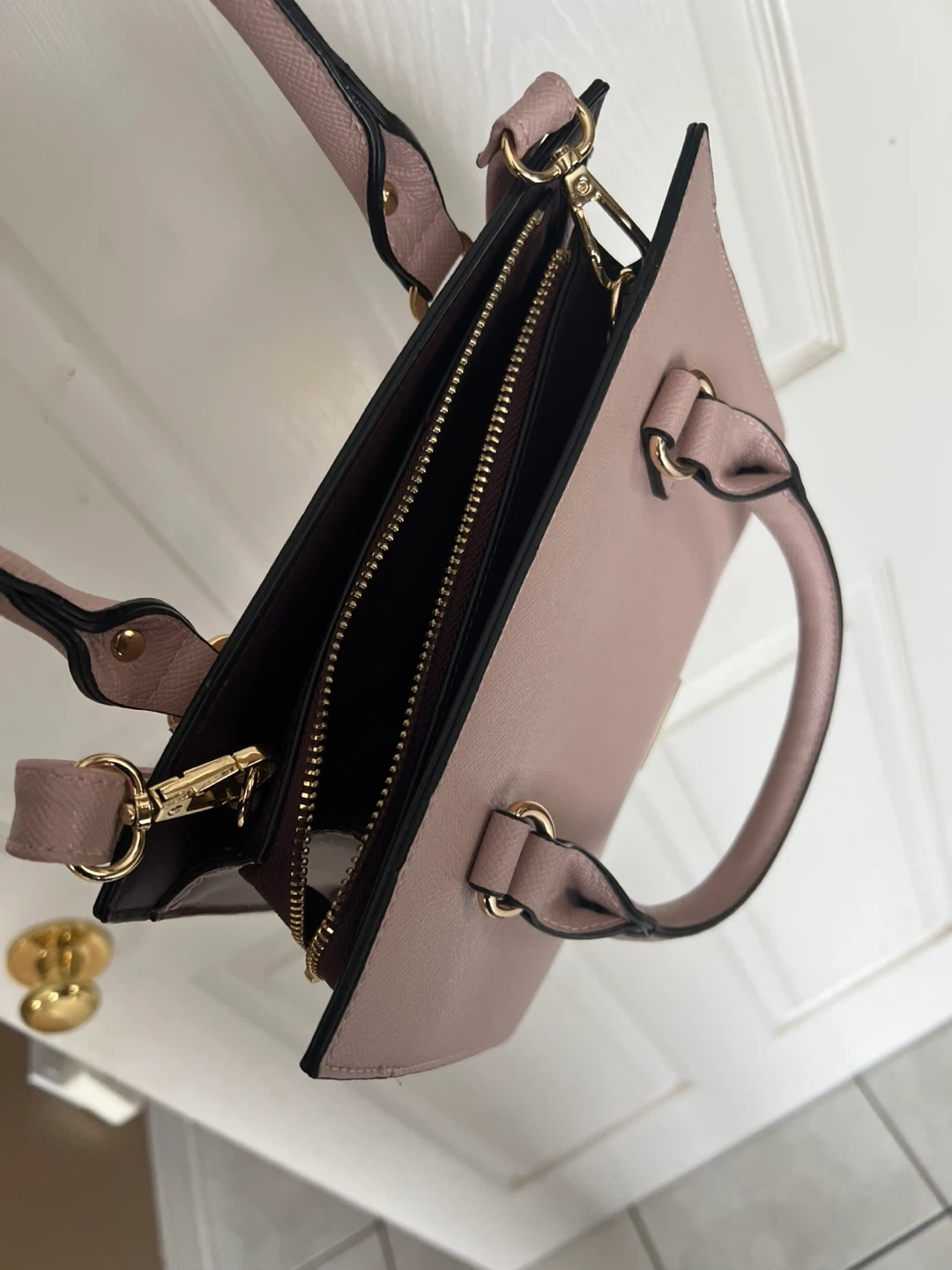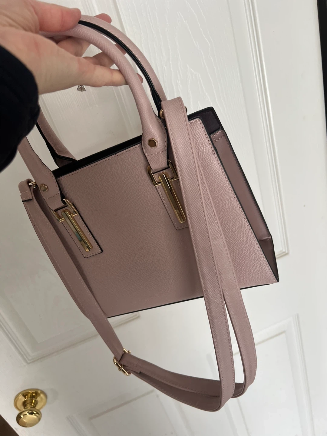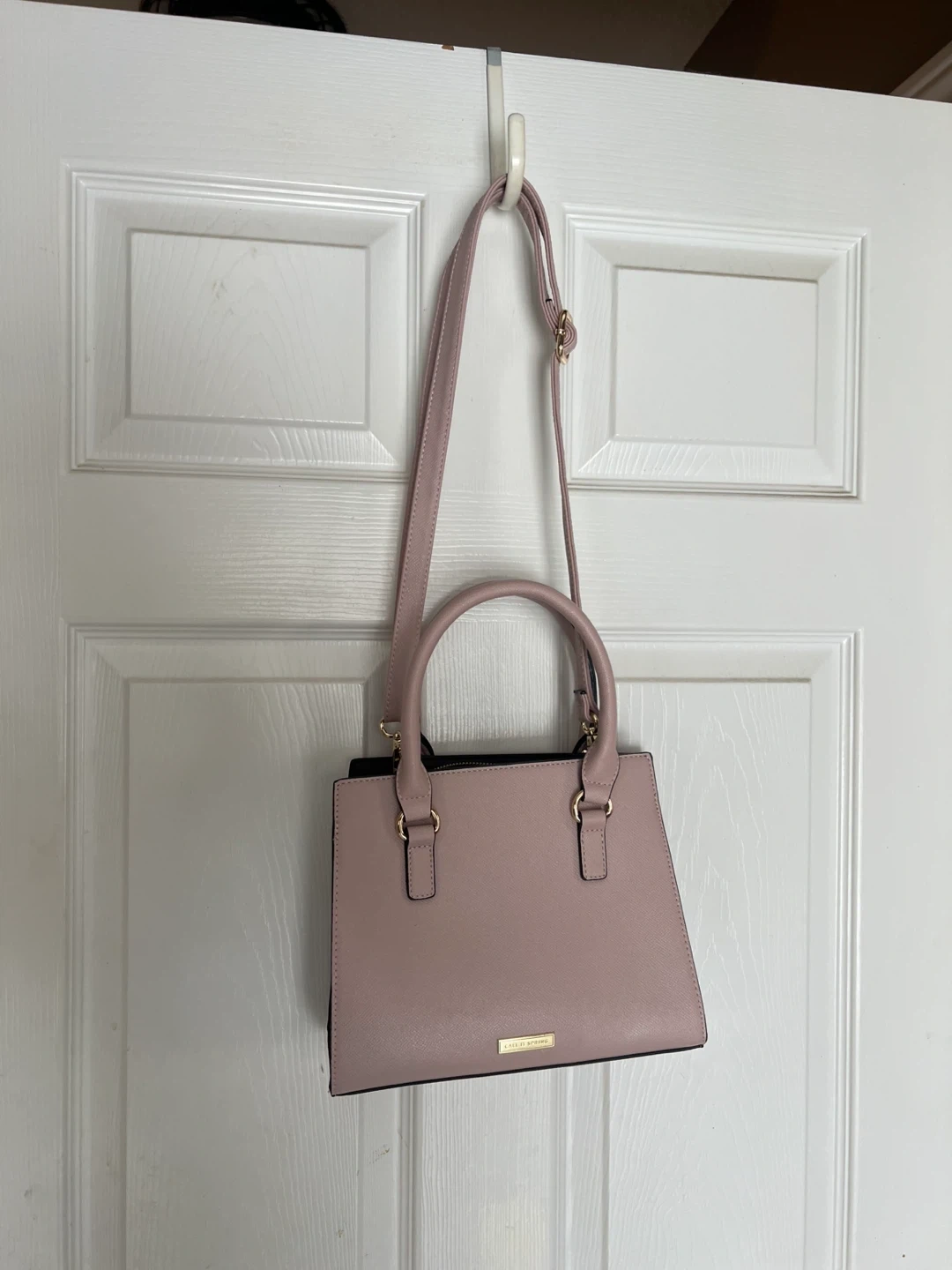 This is a pink satchel handbag from Call It Spring. It's made of faux leather and has gold hardware. It includes a detachable shoulder strap. Like new condition