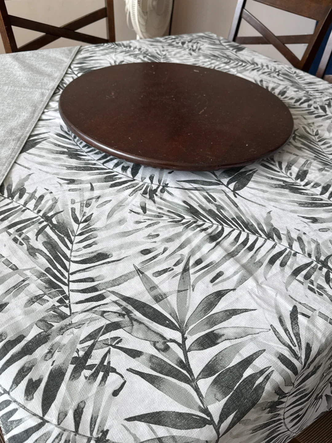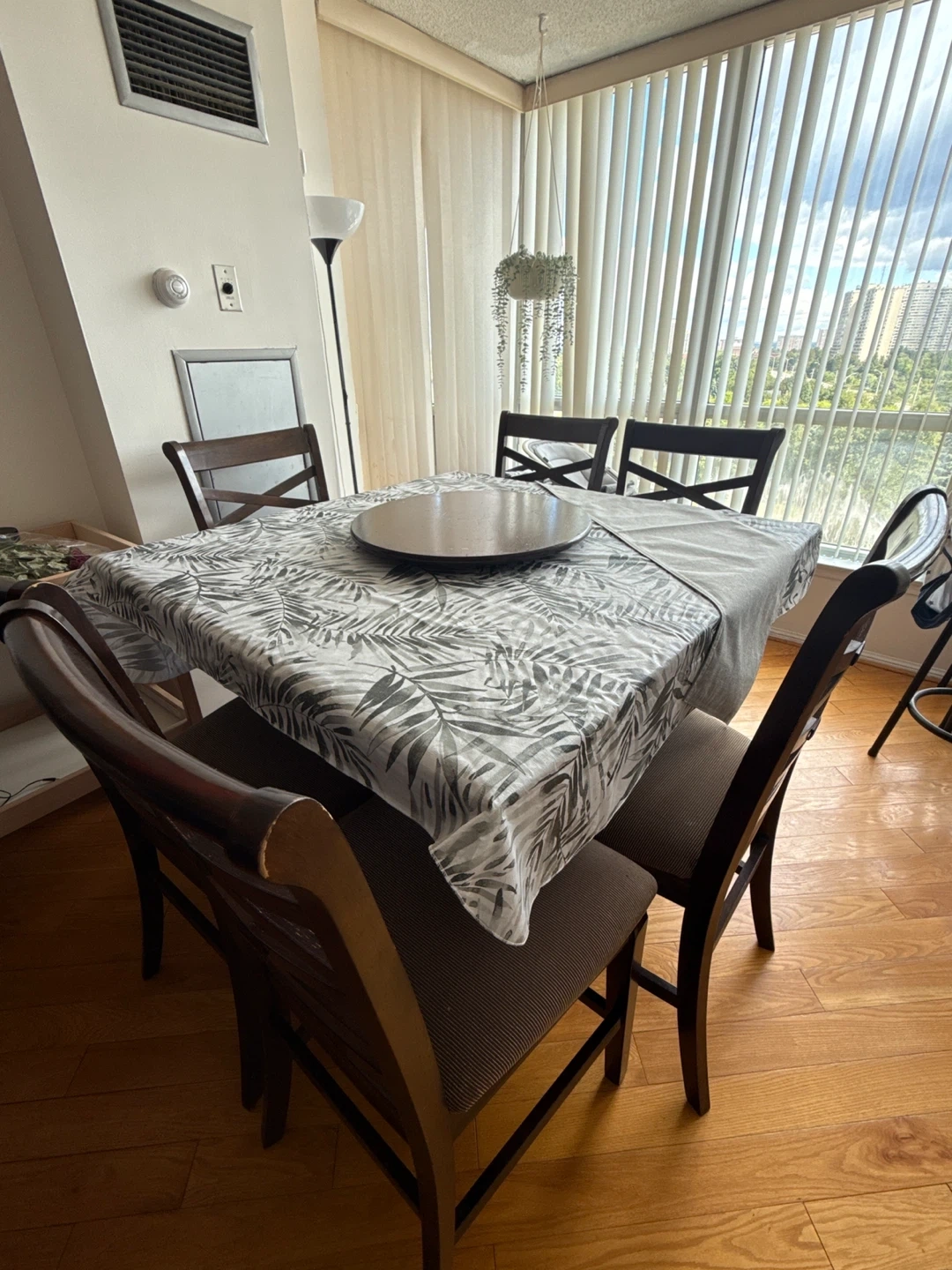 A wooden dining set featuring a rectangular table with a tropical leaf pattern tablecloth. It comes with six matching wooden chairs. Perfect for family meals or entertaining guests!