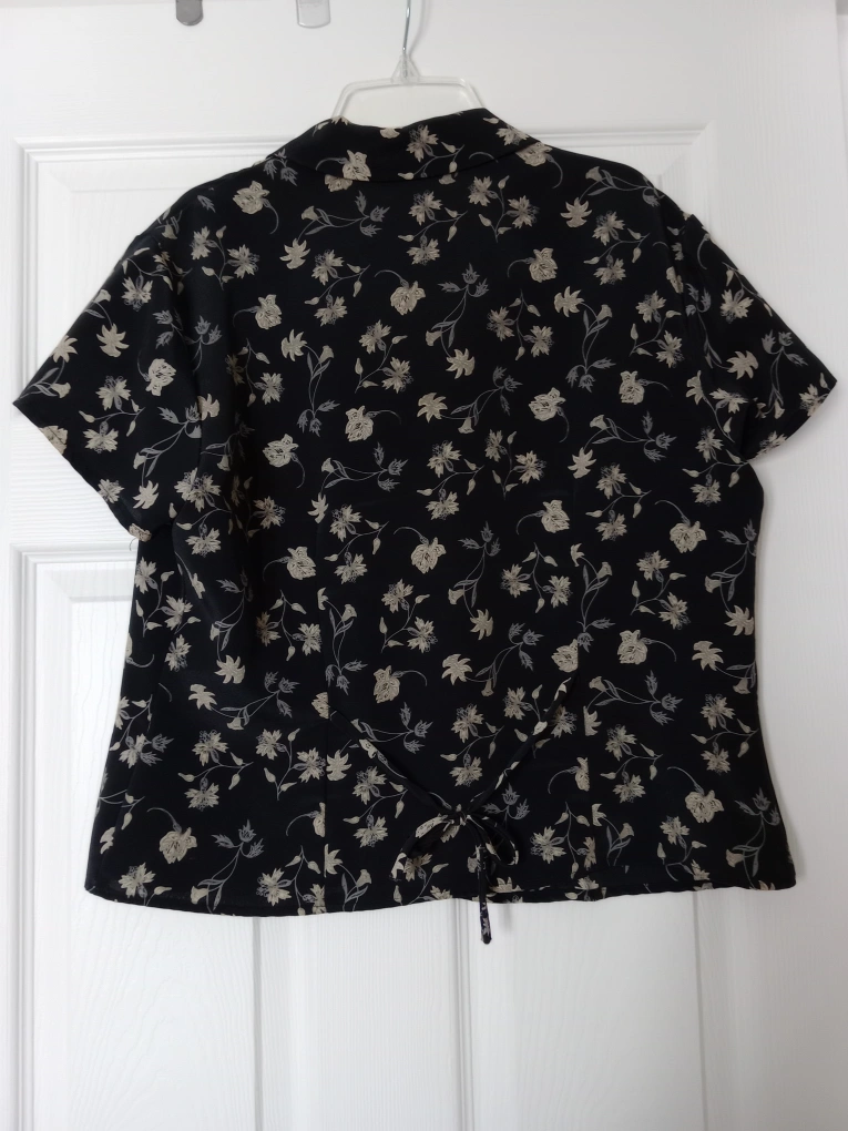 Women's short-sleeved button-down blouse. Black background with beige floral print. Classic style, perfect for work or casual wear. Button closure. Good condition.