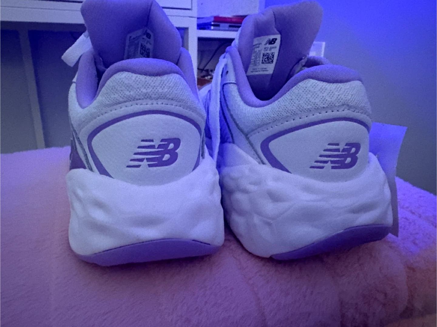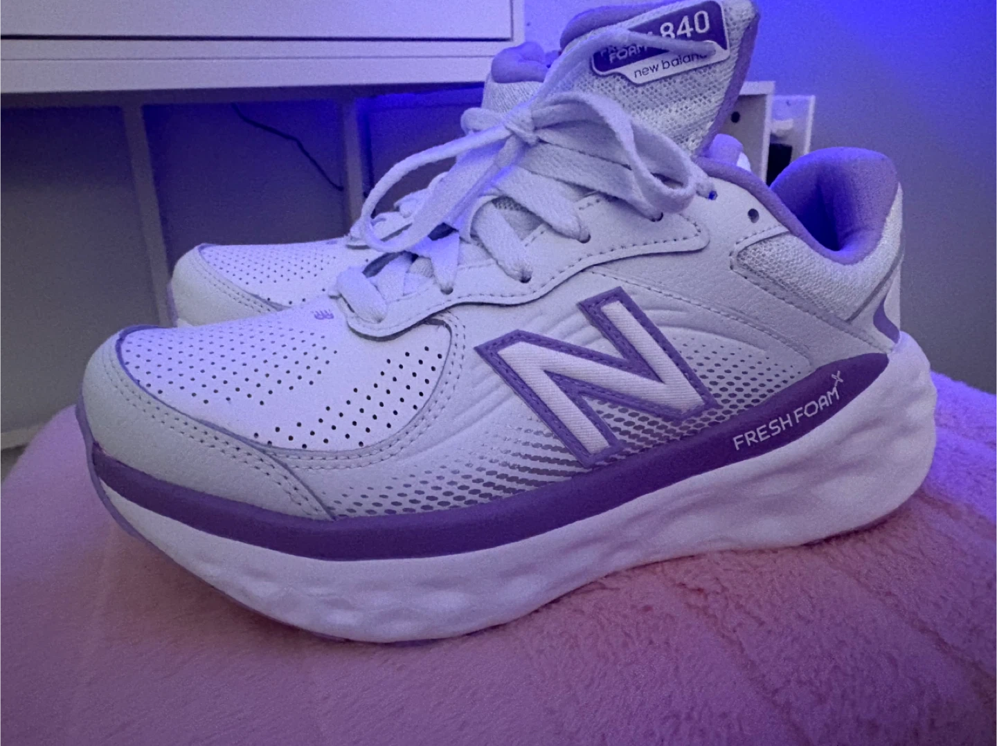 White and purple New Balance Fresh Foam X 840 running shoes. These sneakers feature a breathable mesh upper and Fresh Foam X cushioning for comfort. Size 7 Women's.