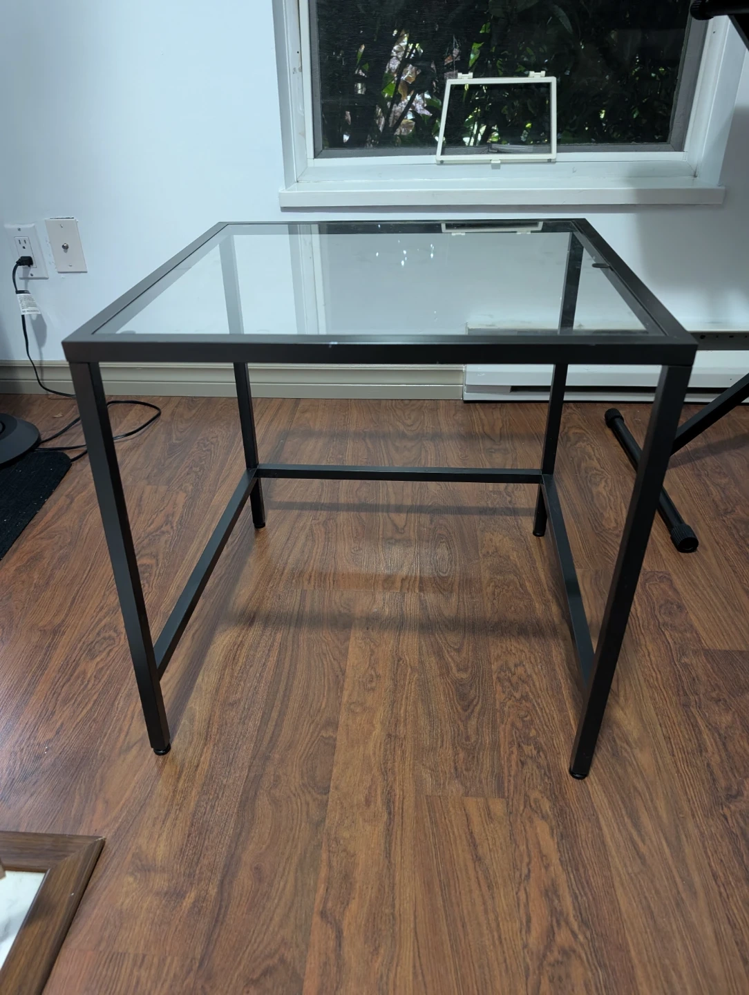 Selling a side table with a glass top and a black metal frame. It's in good condition and would be perfect for a living room or bedroom.