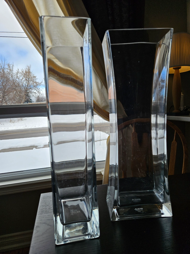 Pair of IKEA tall squared robust glass vases. Can be used on a piece of furniture or on the floor. Very sturdy.