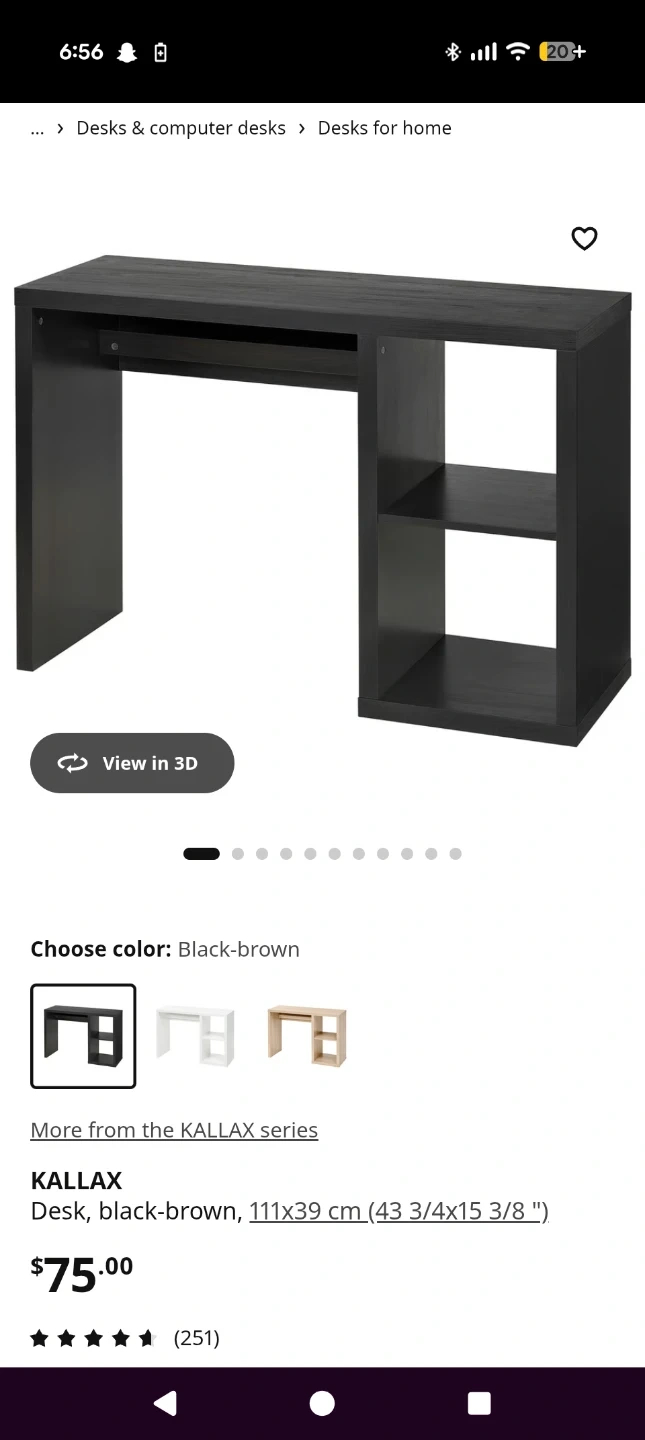 This black office chair from Staples features a faux leather seat and chrome base with wheels. It's paired with a black-brown IKEA KALLAX desk that has built-in shelving. The desk dimensions are 111x39 cm.