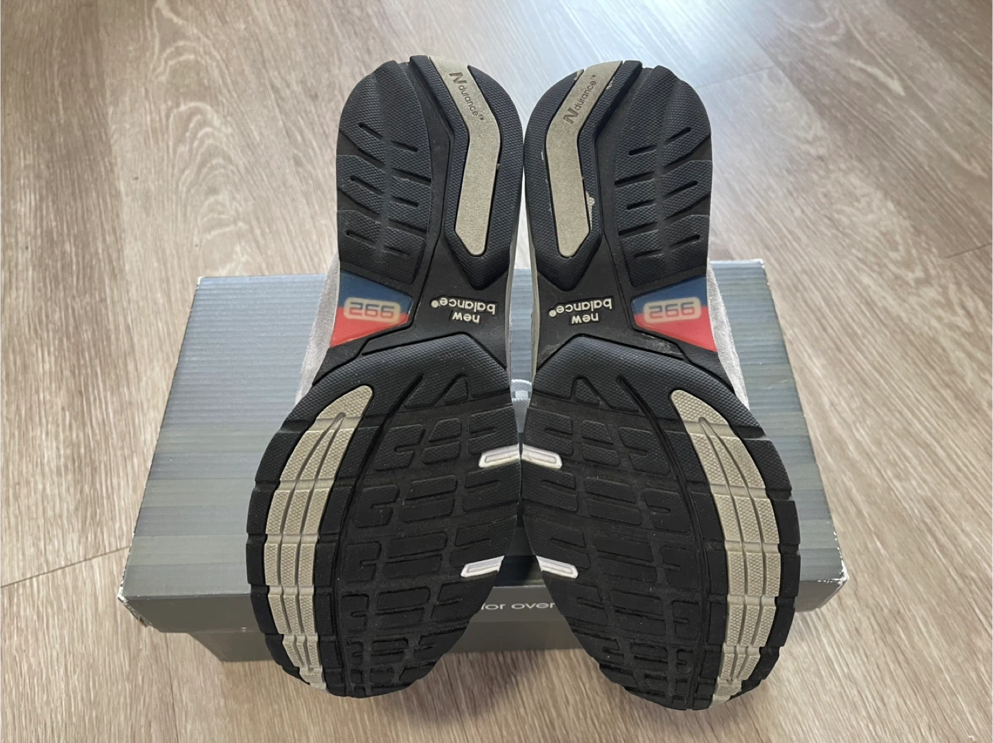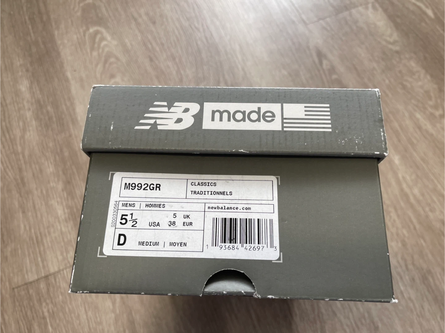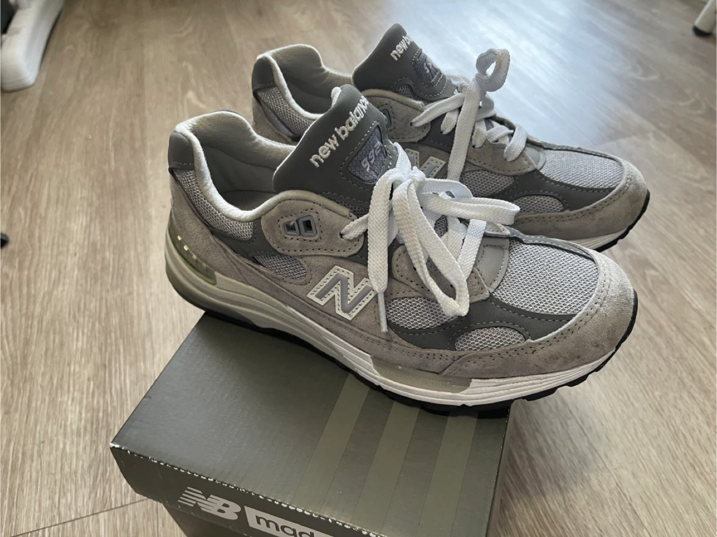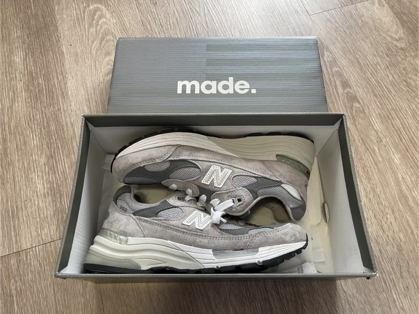 Classic New Balance 992 running shoes in a versatile grey colourway. These sneakers are crafted with a mix of suede and mesh materials for comfort and durability. Original box included.