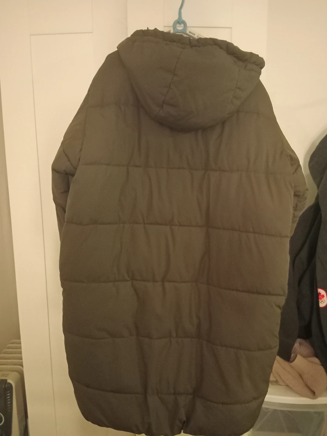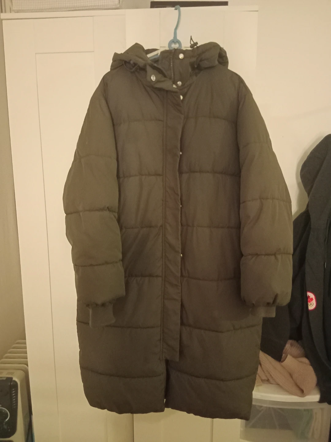 This is a long green puffer coat from H&M. It's a women's size medium with a hood. Made in China.