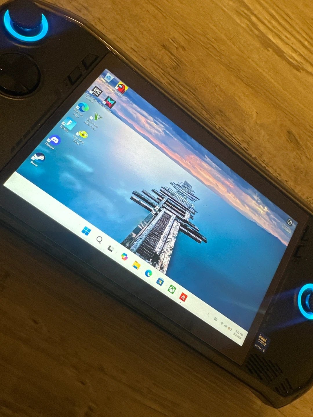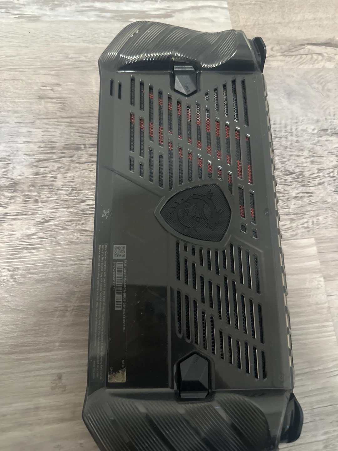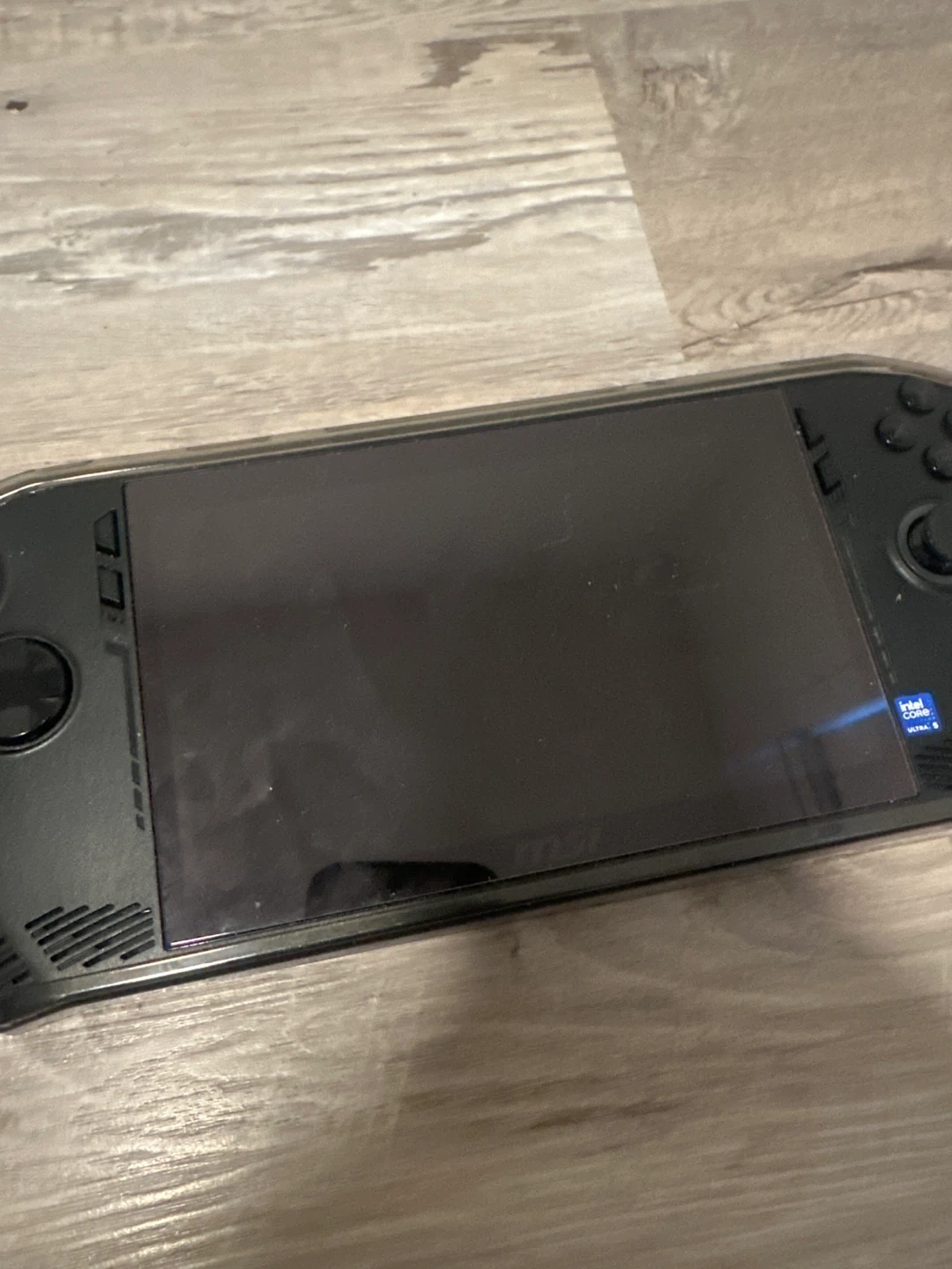 MSI Claw AIM handheld gaming PC with Intel Core Ultra 5 processor and 16GB RAM. It has a 128MB graphics card and 477GB of storage. Runs Windows 11 Home with 64-bit operating system. Features 64-bit operating system, pen and touch support with 10 touch points.