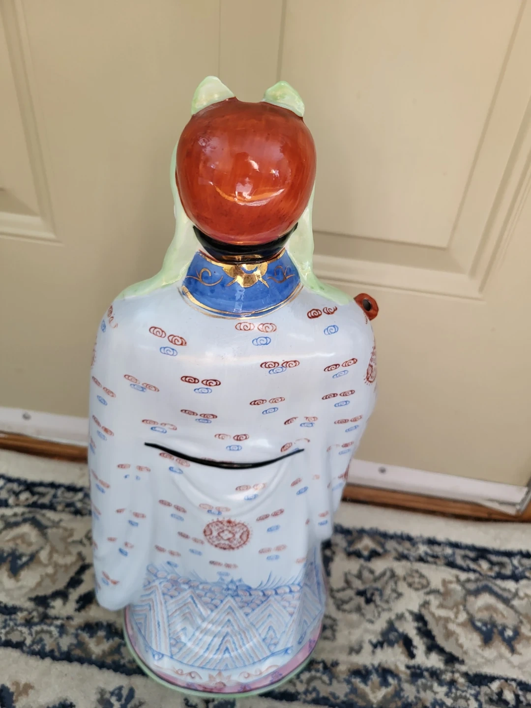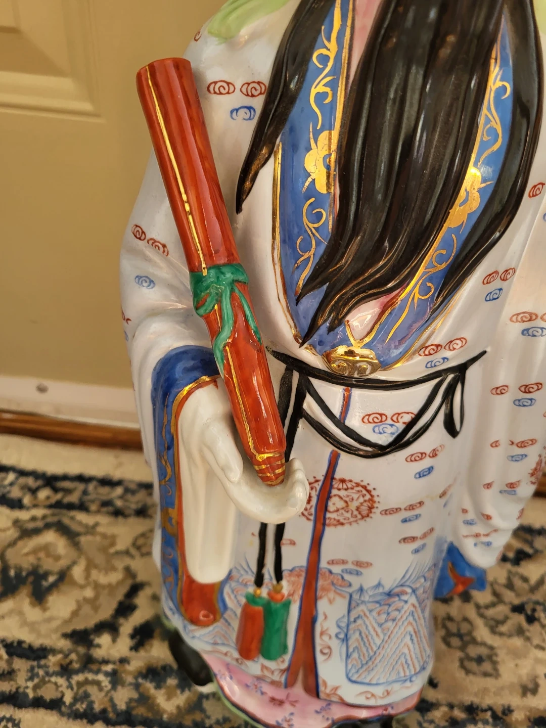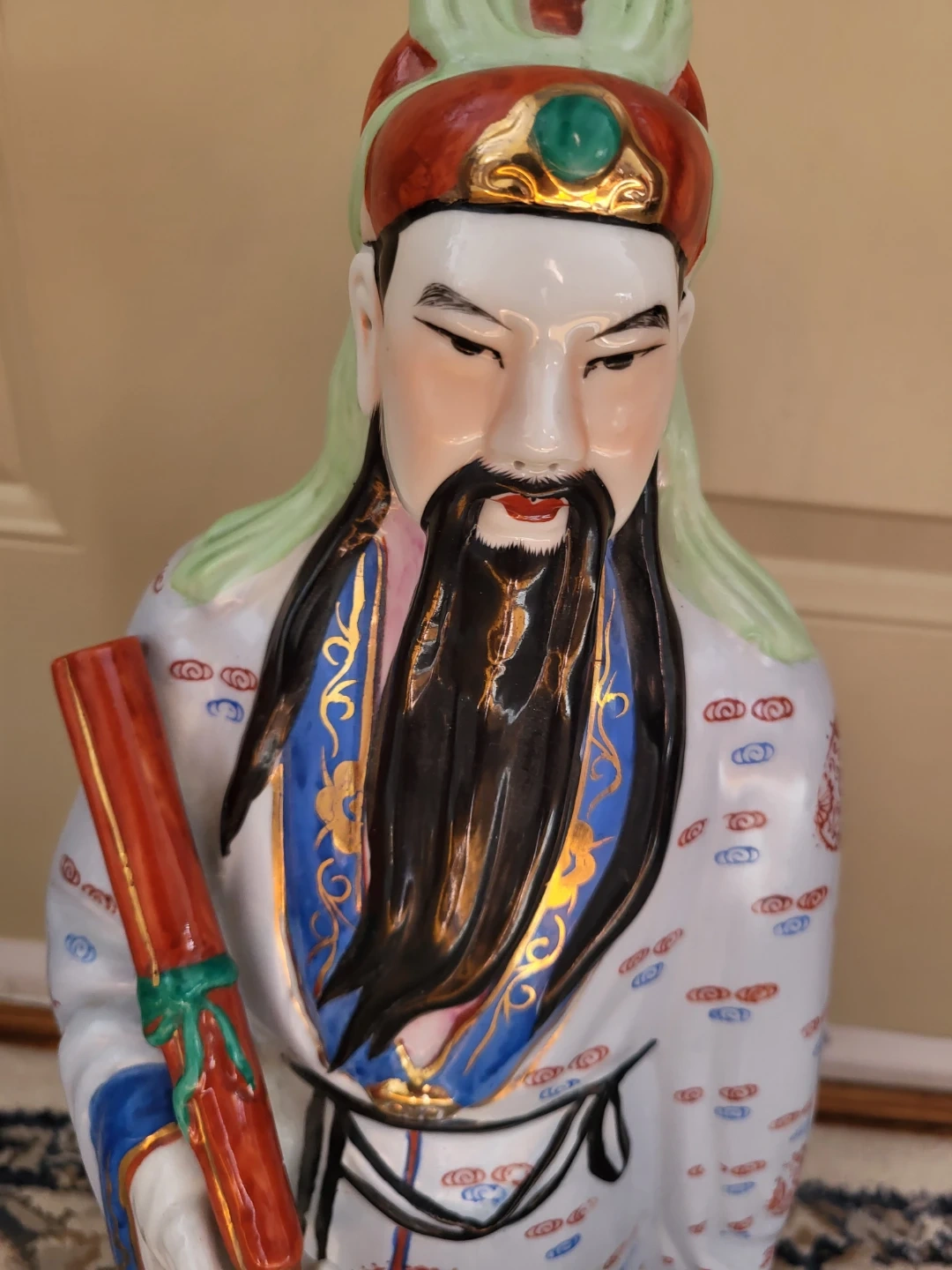 This is a large, decorative porcelain figurine of a Chinese Scholar. It's intricately painted with a white robe featuring blue and red cloud and mountain patterns, and gold accents. He holds a red scroll with green ribbon detail. This piece would make a statement in any room.