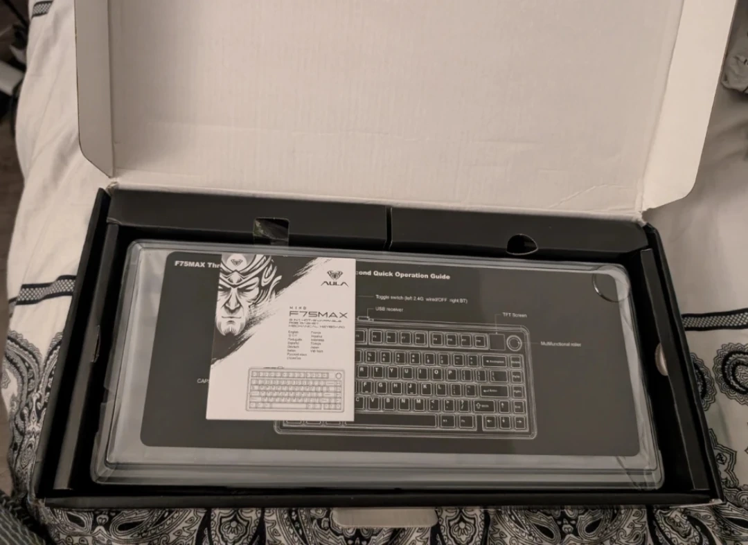 AULA F75 Max 3-in-1 hot-swappable RGB gasket mechanical keyboard. It features a TFT screen and multi-functional knobs. Includes receiver for wireless connectivity.