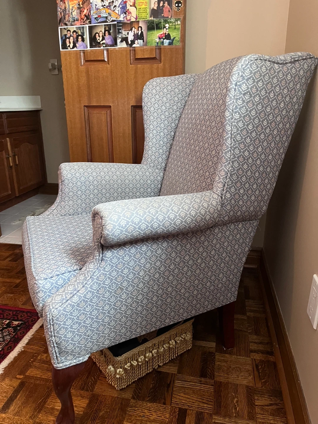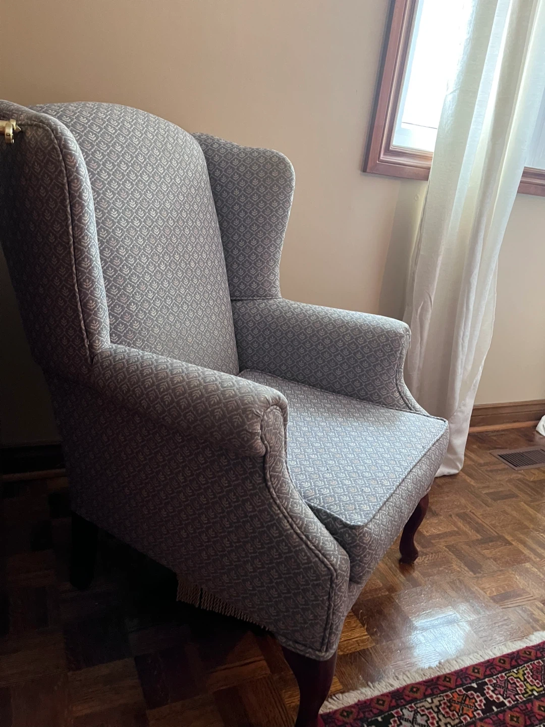 Classic wingback armchair upholstered in a patterned fabric. Features ornate wooden legs. Provides comfortable seating. $90 FOR BOTH. message for separate!