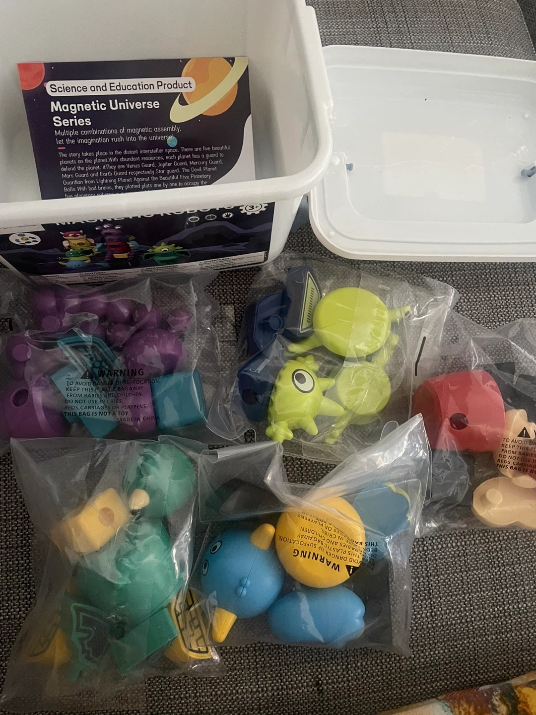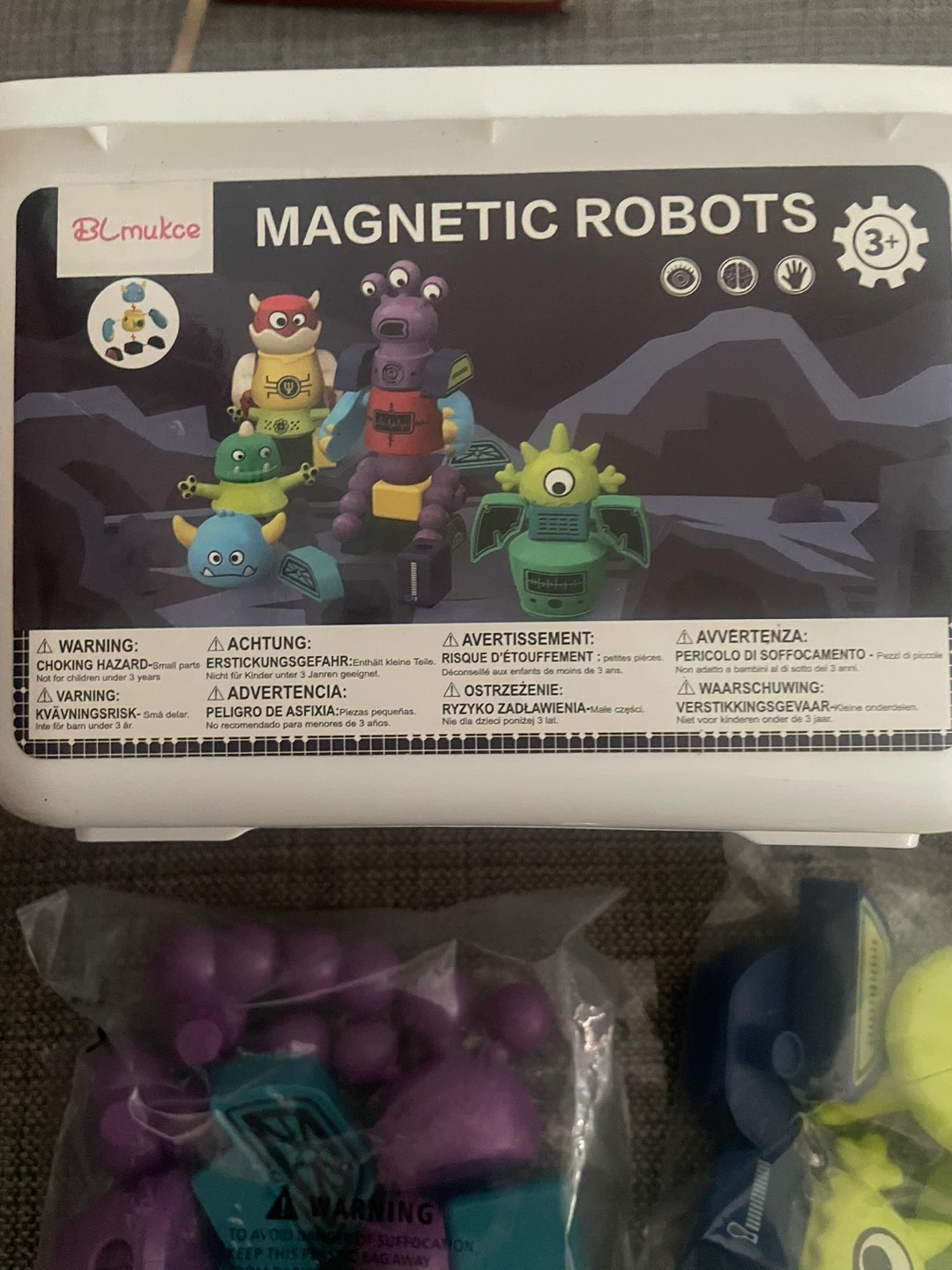 This set includes magnetic pieces for building robots. It's recommended for ages 3 and up. The set comes with multiple colourful components for creative assembly.
