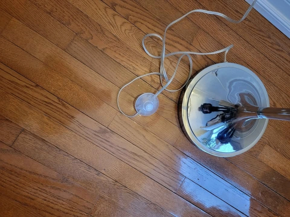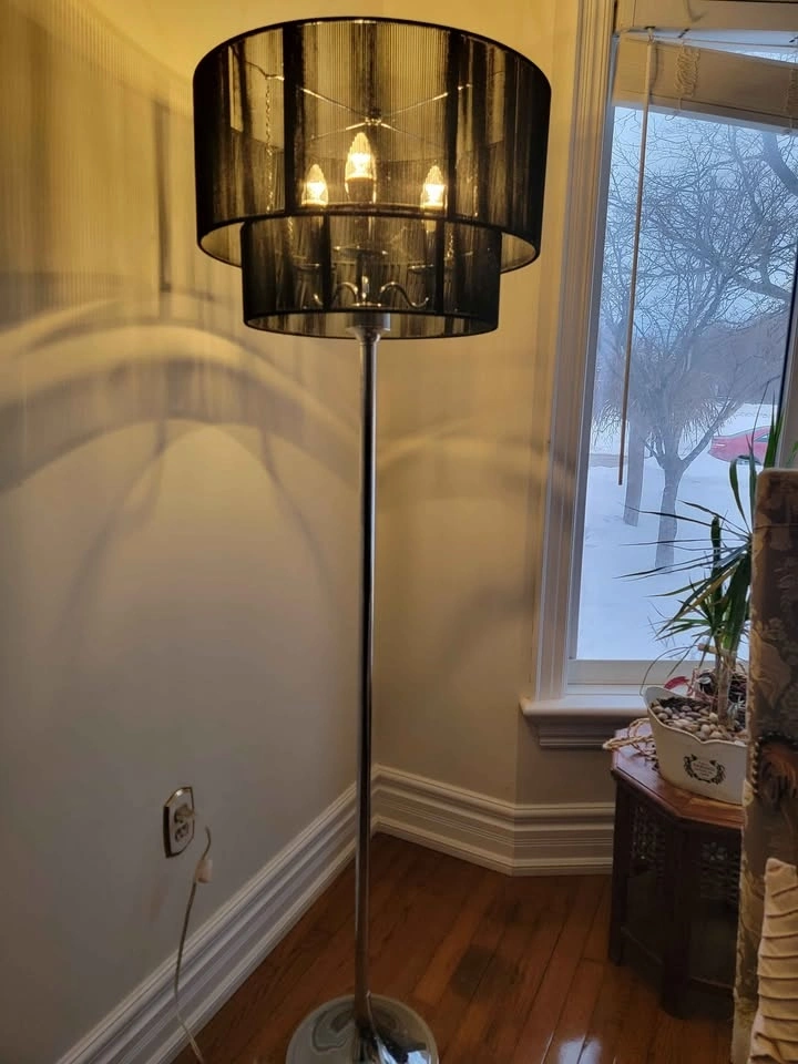 Stylish floor lamp featuring a unique double-layered black mesh shade and a high-polish chrome pole and base. Foot switch on cord. Lights up a room nicely. $90 or make an offer.