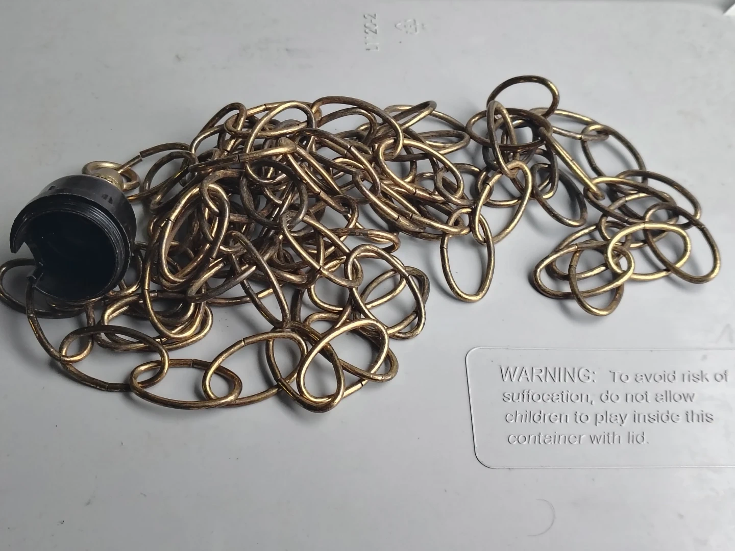 This is a brass-coloured chain with a black end cap. It's suitable for hanging light fixtures or decorative items. The chain appears to be made of metal.