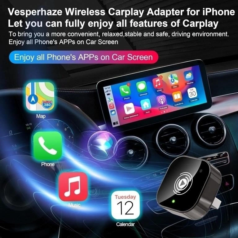 This adapter allows you to use CarPlay wirelessly with your iPhone. Simply plug it into your car's USB port and it's ready to go. Enjoy a seamless connection for your music, navigation, and calls.