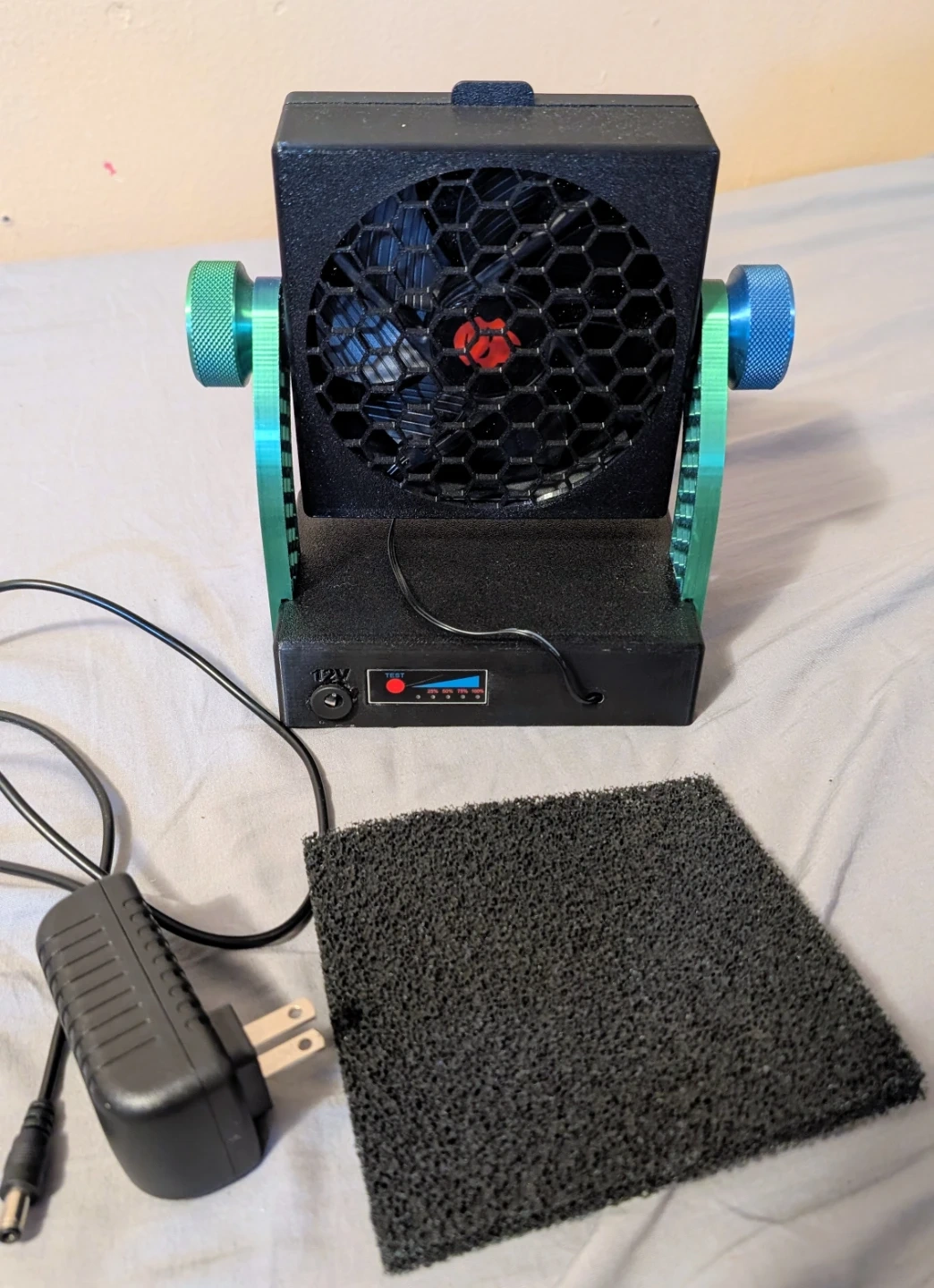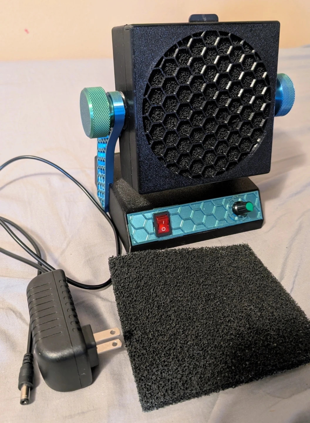 This DIY 3D printed adjustable fume extractor fan is great for soldering projects. It features a honeycomb grill and a speed control knob. Includes a 12V power adapter and a replacement carbon filter. It is rechargeable. It can work with or without a power adapter. It's designed to pull solder fumes away from your workspace. This unit is ideal for hobbyists working with electronics or small crafts.