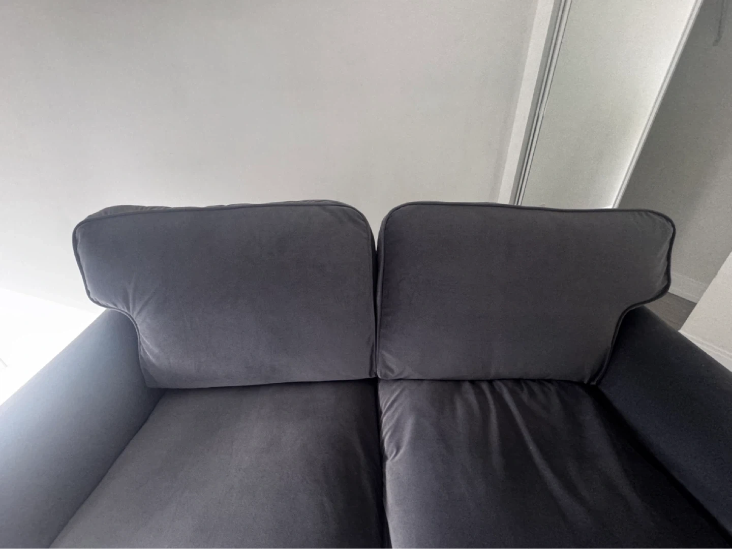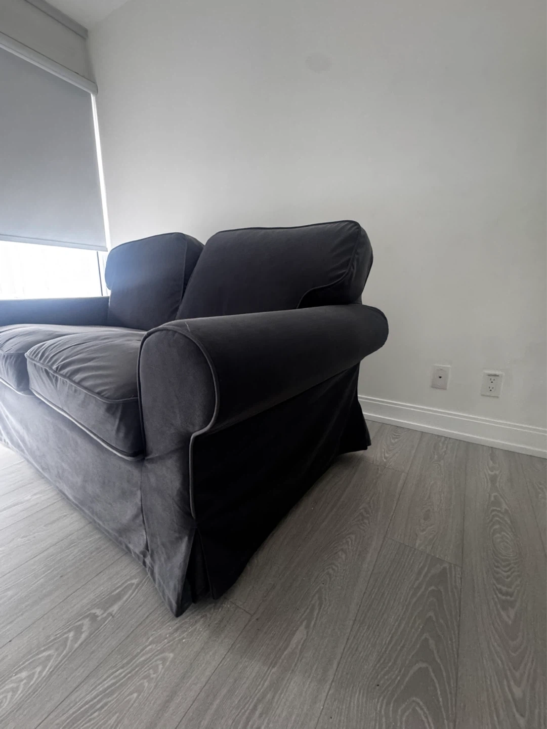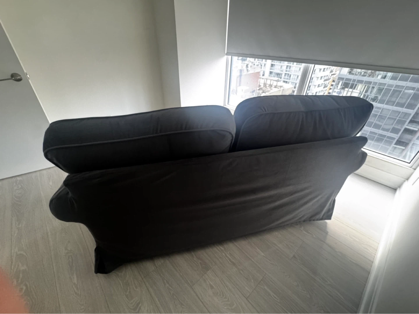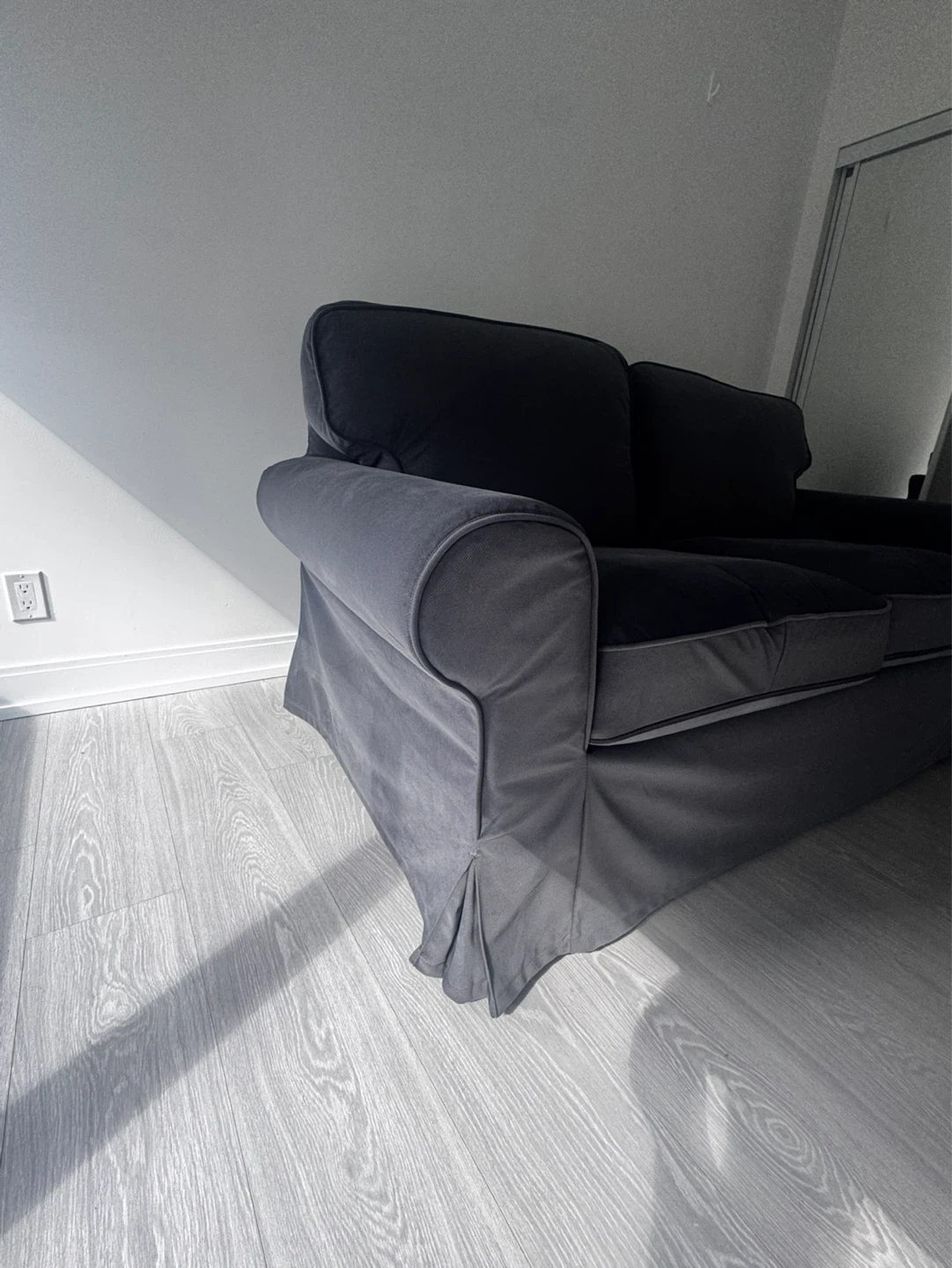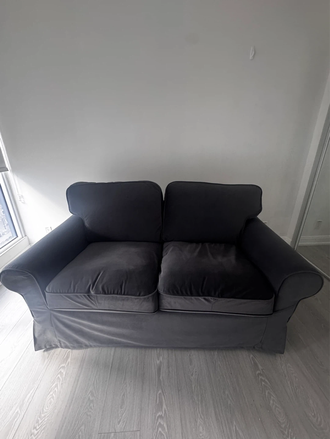 Need this to be picked up asap!!!!!! Bought for 640 from ikea, Cloud grey two-seater sofa with plush removable covers. It's 182 cm wide and 92 cm high. Perfect for a living room or apartment space. Seat depth is 58 cm. Clean and pet free environment. Used for only 1 year, selling because I am moving soon. Pickup only.