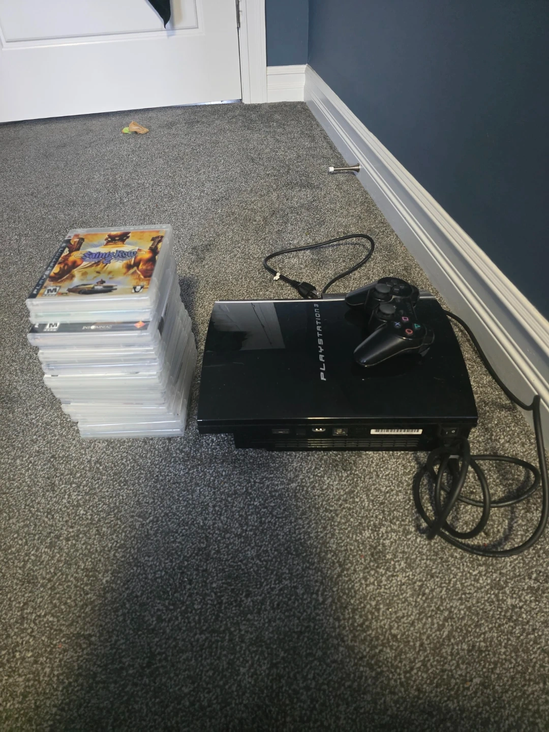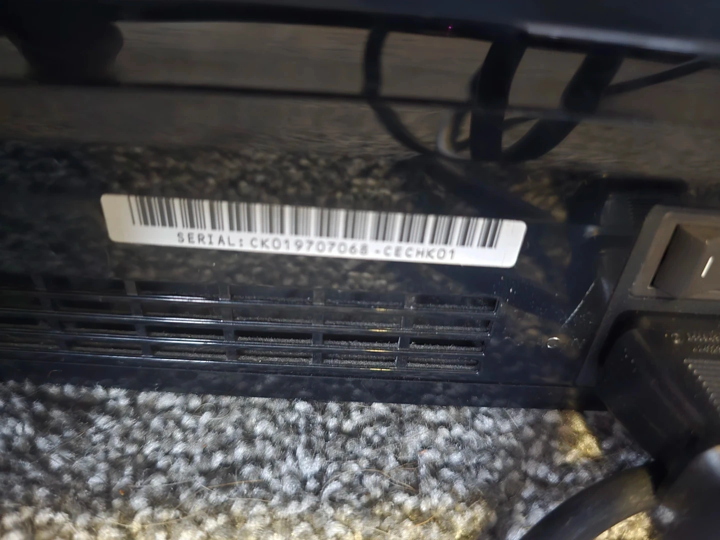 This is a black PlayStation 3 console. It comes with one controller and a stack of games. All necessary cables are included for setup. This unit's serial number is CK019707068-CECHK01.