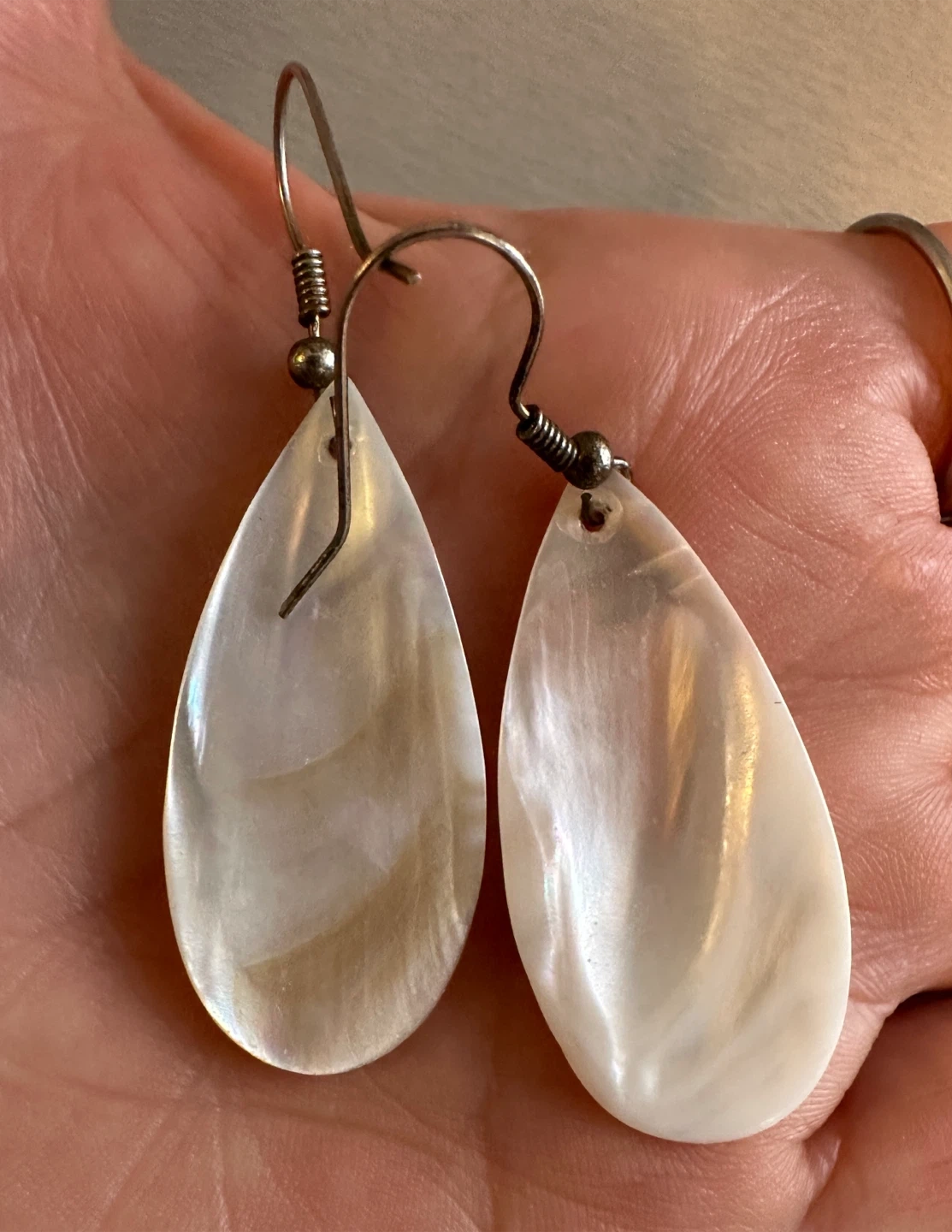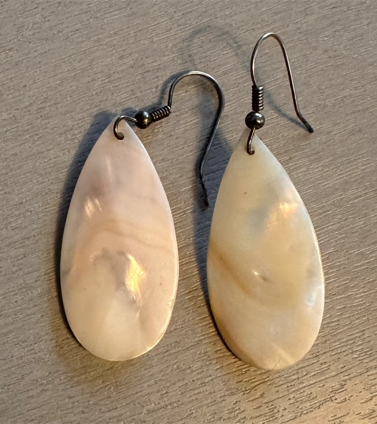 Selling a pair of lovely teardrop earrings made of mother of pearl, with a beautiful iridescent sheen. The earrings are in great condition and would make a wonderful addition to any jewelry collection