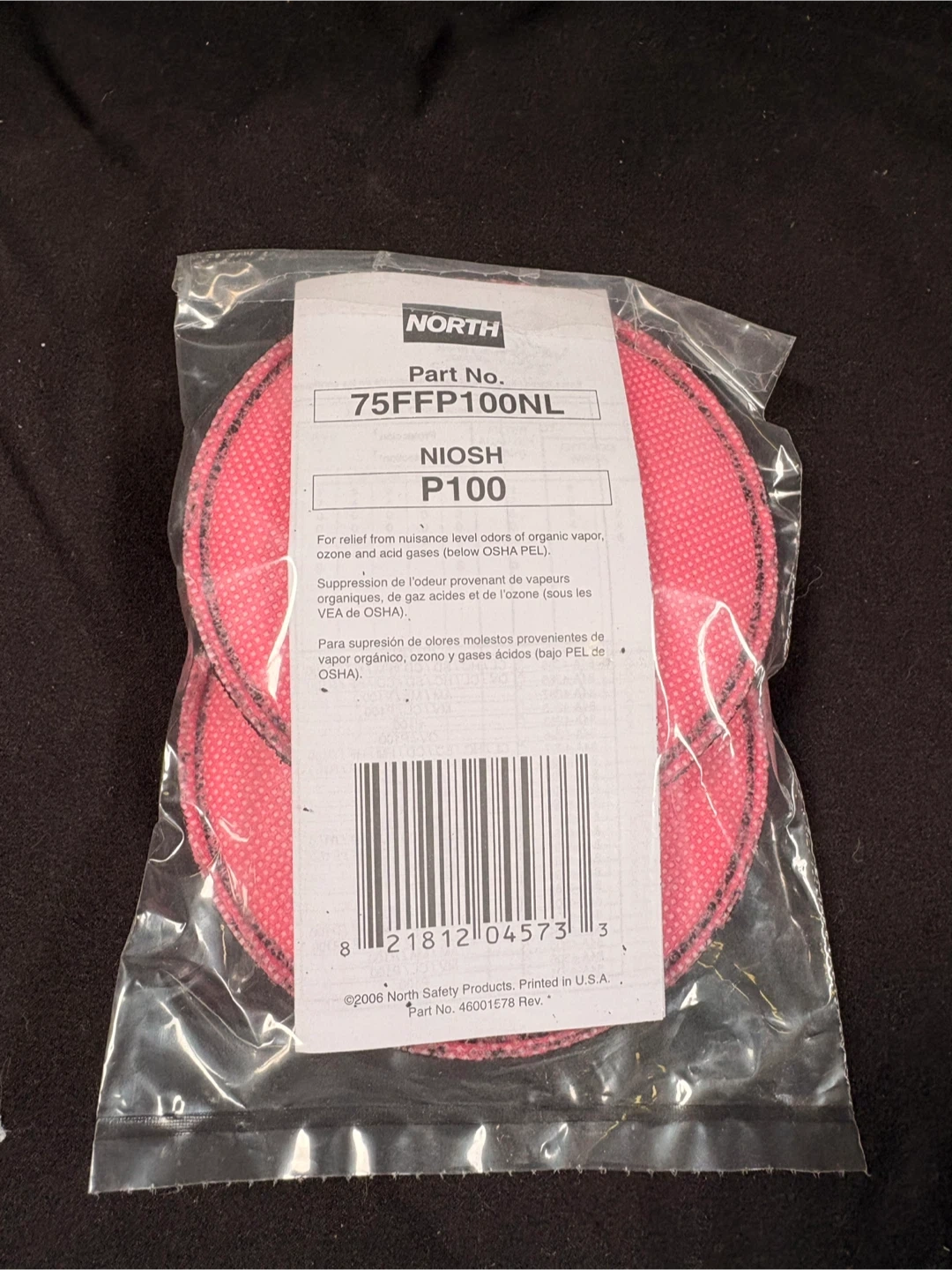North 75FFP100NL NIOSH P100 respirator pads. Designed for relief from nuisance level organic vapours, acid gases, and ozone. Comes in a pack of two.