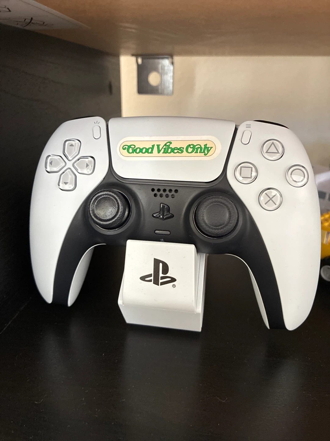 PlayStation 5 console and DualSense controller. Includes original stand for console. Controller has a 'Good Vibes Only' sticker on it. This gaming system offers next-gen performance and immersive gameplay!
