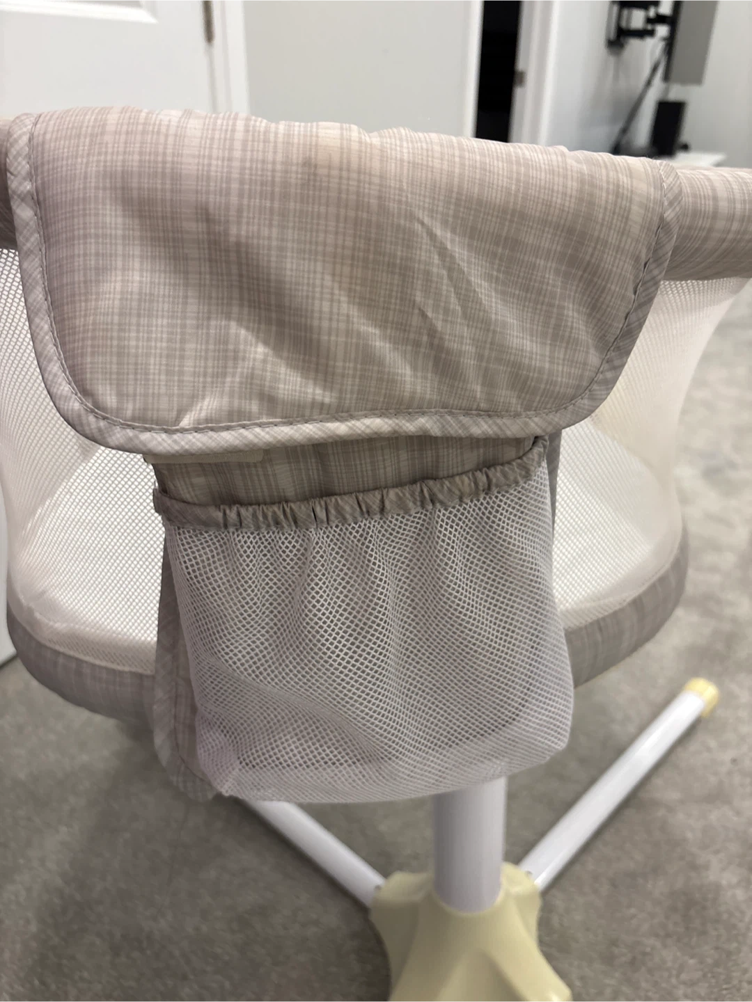 This Halo Bassinest Swivel Sleeper provides a safe and convenient space for your infant. It features a breathable mesh siding and a rotating arm for easy access. Includes a storage pocket on the side.