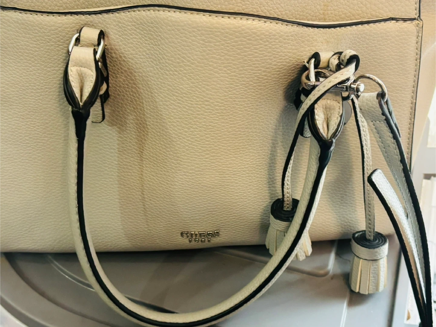 This light grey Guess tote bag is made of faux leather. It features a zippered closure and a leopard print interior. The bag has tassels and silver hardware.