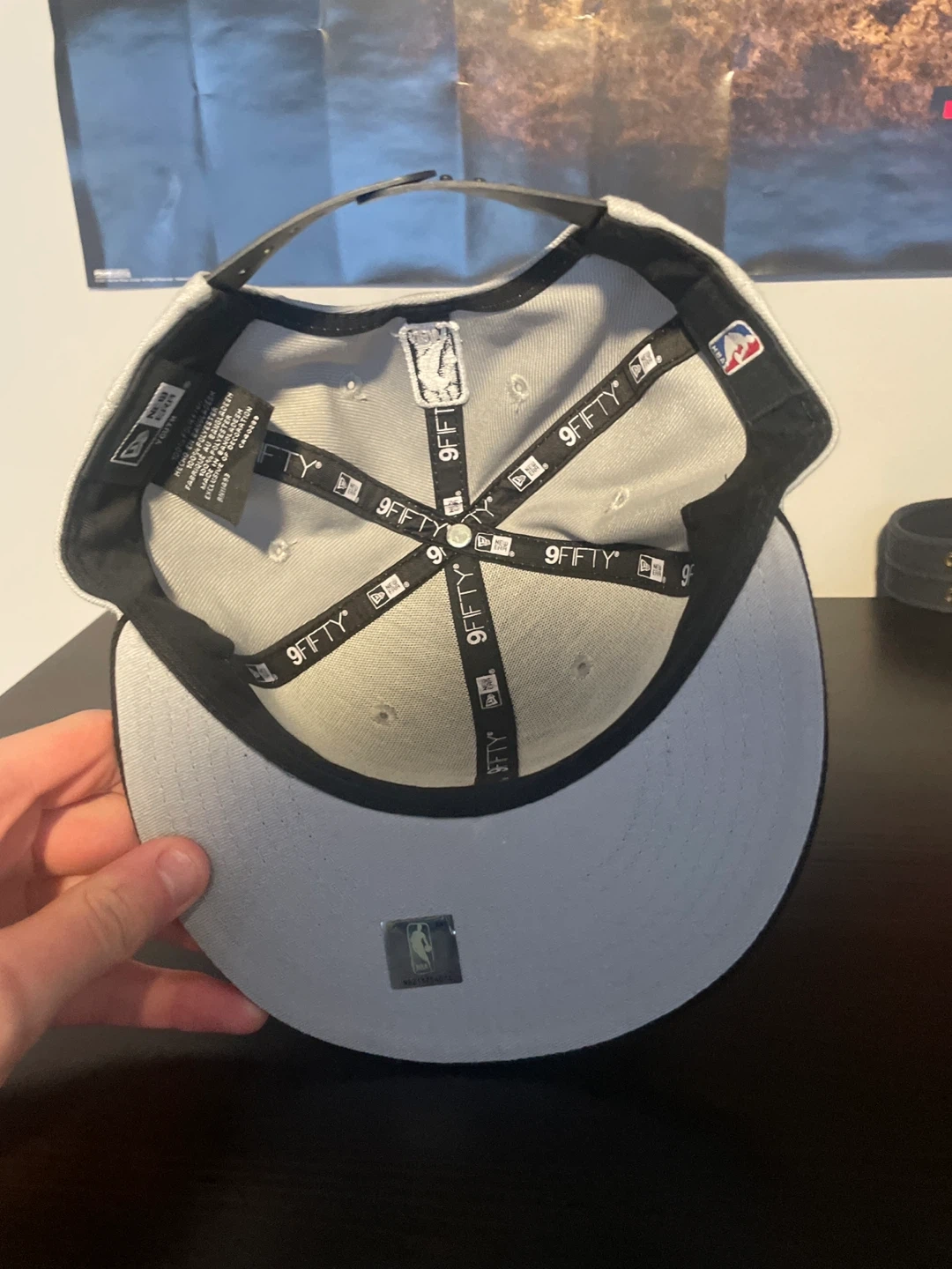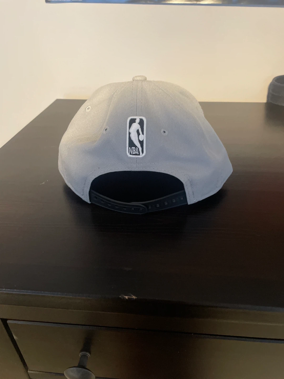 This is a New Era baseball cap featuring the Toronto Raptors logo. It's a grey cap with a black brim. The NBA logo is also visible on the back.
