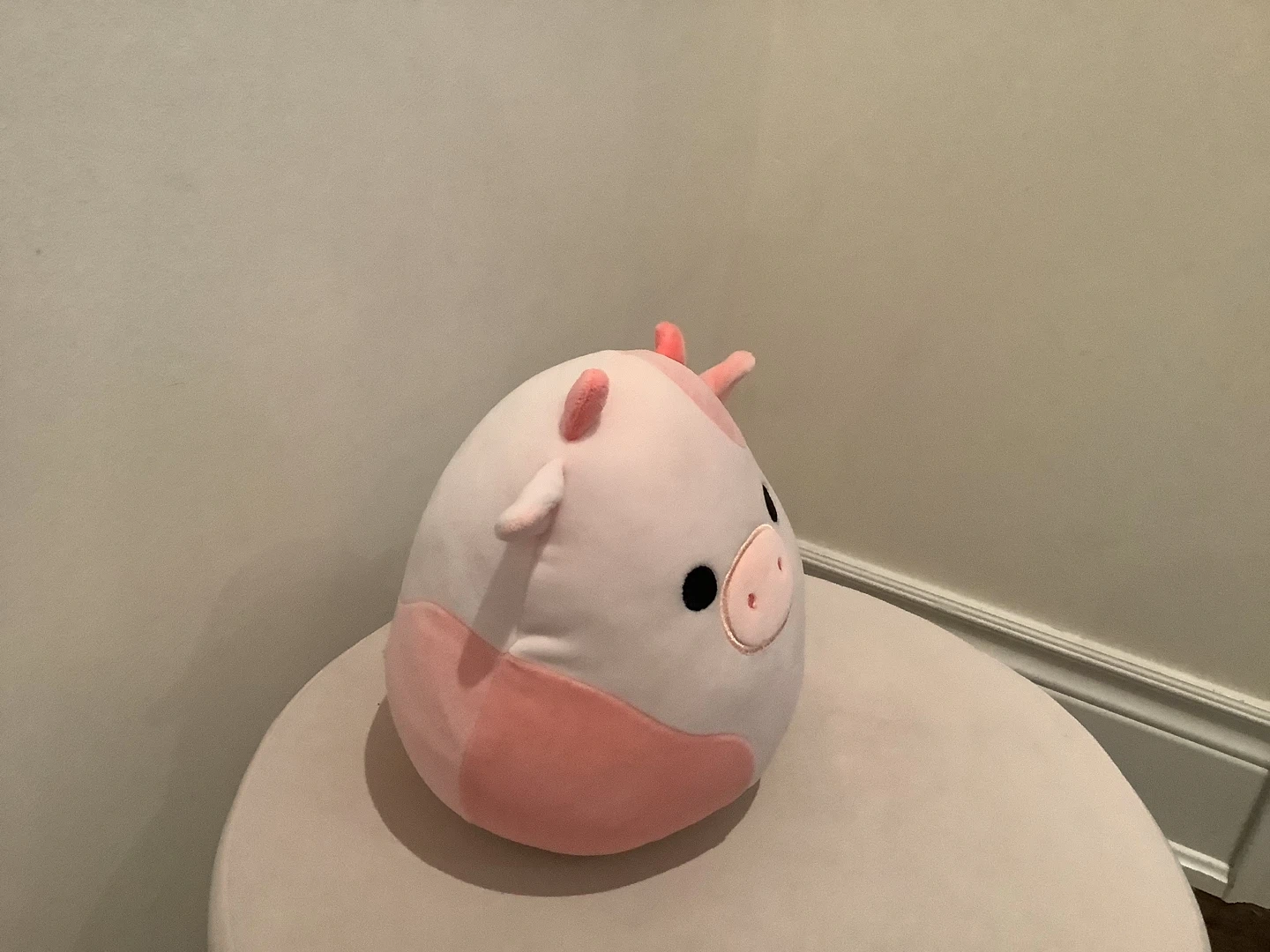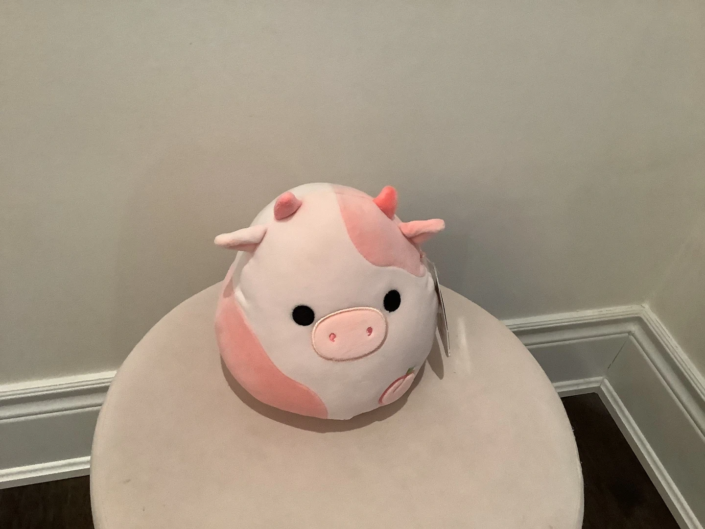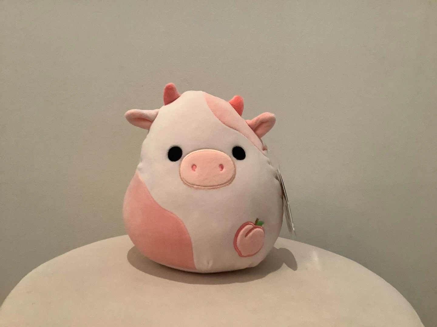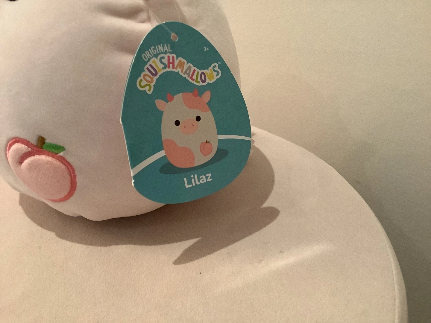 This is a soft and cuddly Original Squishmallows plush toy named Lilaz. It's a cute cow with pink patches and embroidered fruit details. Perfect for playtime or as a comforting friend!