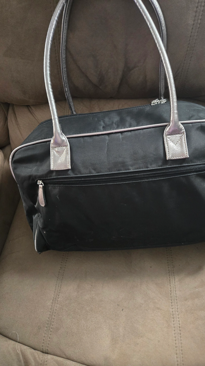 Check out this used Avon travel bag, perfect for your next getaway! This stylish black bag features silver accents and a spacious pink interior with multiple compartments to keep your belongings organized. It's in good condition and ready for new adventures.