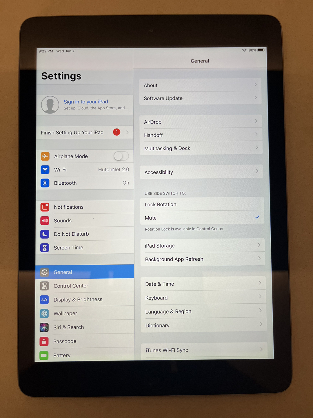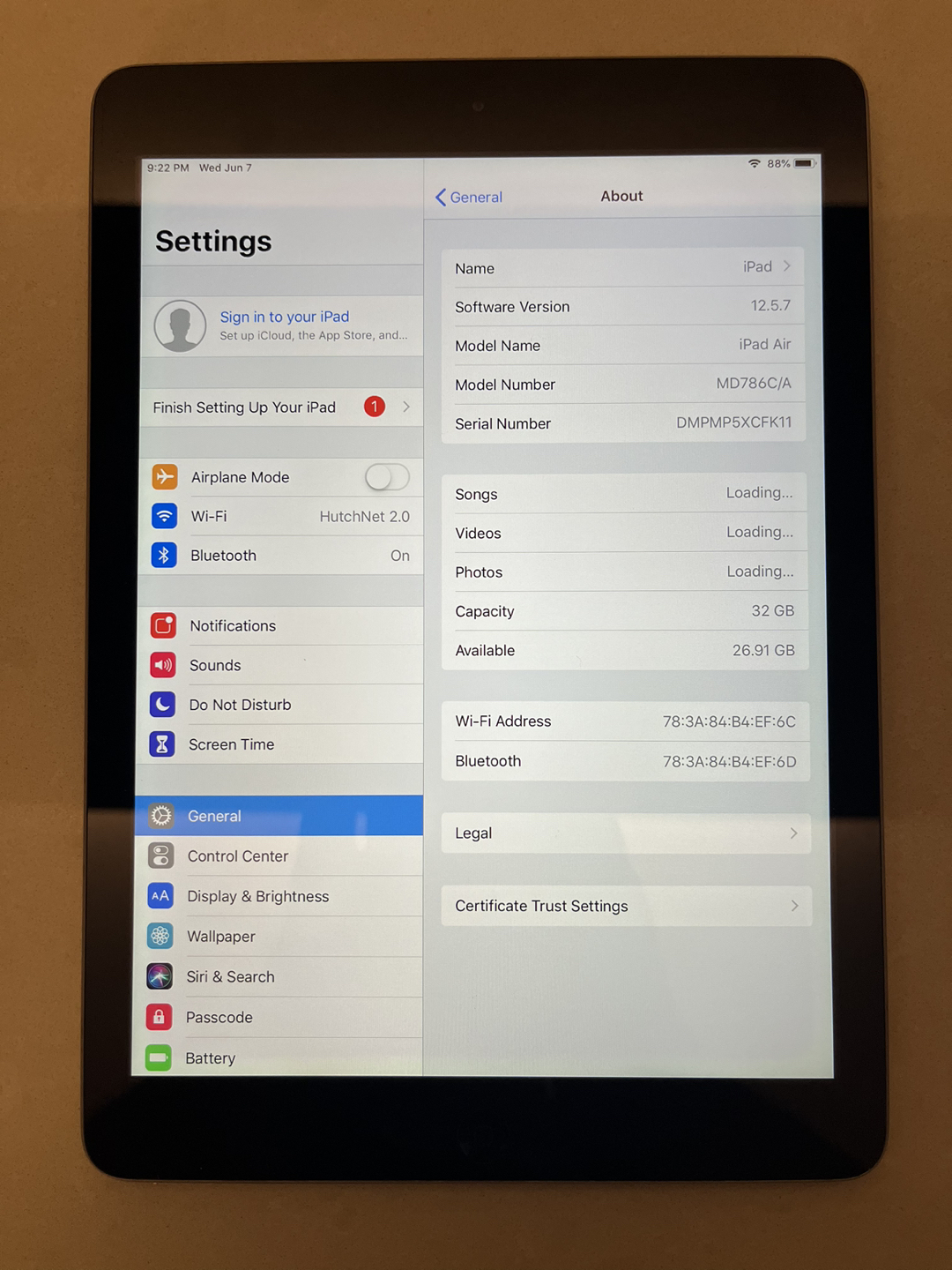 5iPad Air, 1st generation, 32GB, WIFI. Factory reset and iCloud account removed. In great condition. No cracks or scrapes. Works without issues. Supports up to iOS 12.5.7. Includes charger and USB cable.
