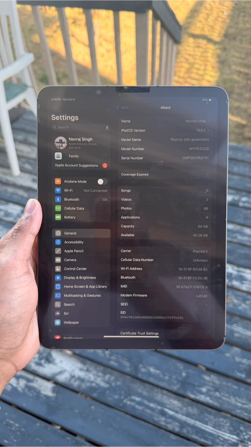 5Selling my iPad Air 4, 64GB, Wi-Fi + Cellular. Works perfectly, battery in excellent condition, and looks like brand new with no scratches or signs of use. Comes with original charger. Ideal for streaming, browsing, work, or study. Clean, fully functional, and ready to go. Serious buyers only.