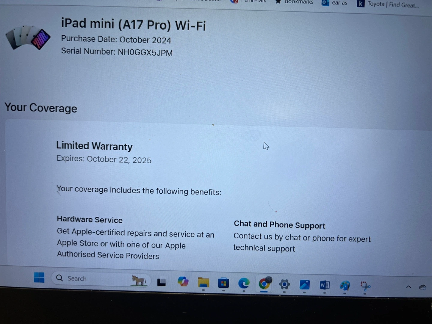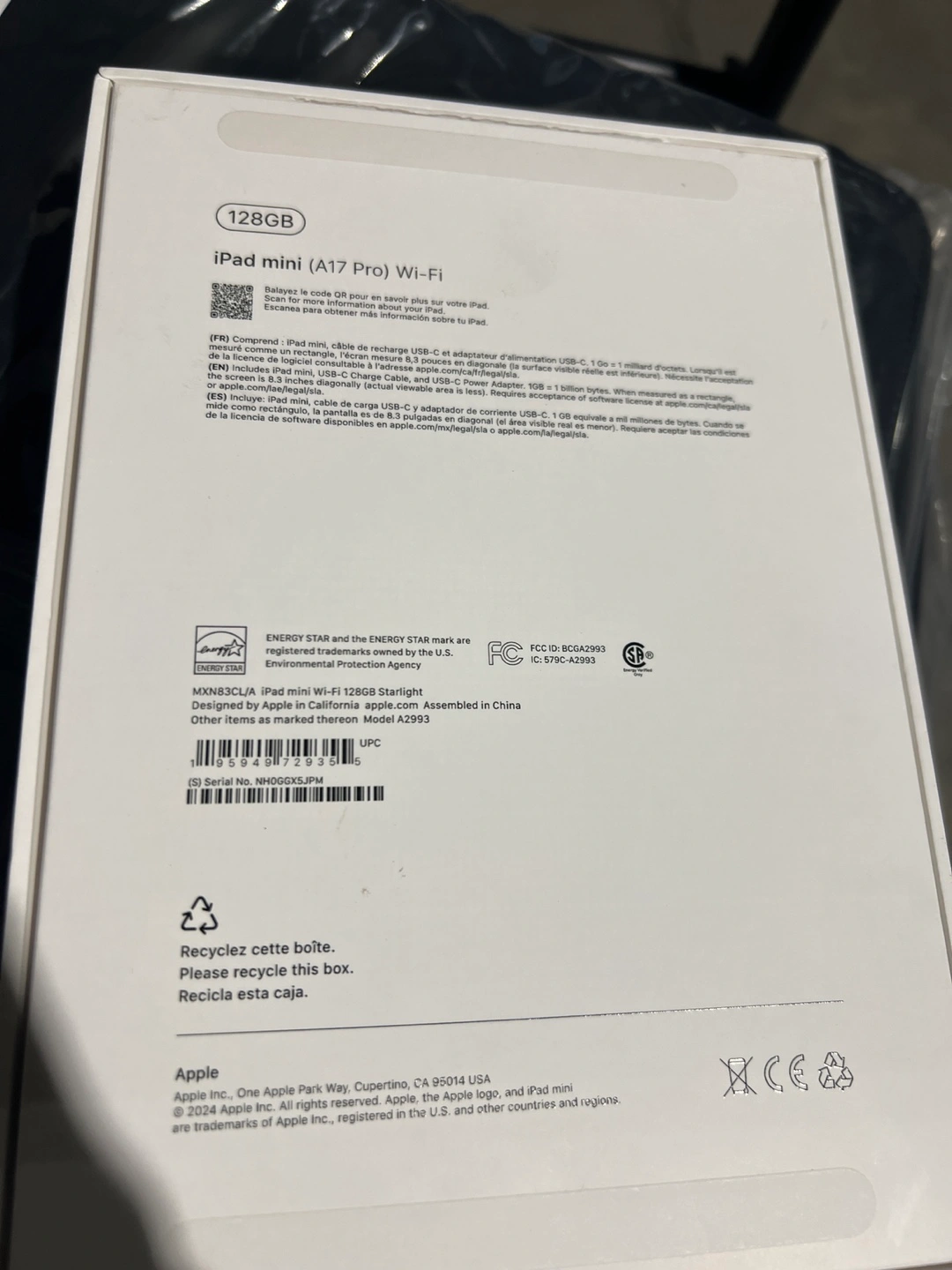 75iPad mini (A17 Pro) with 128 GB storage. Wi-Fi only. Purchased October 2024. Limited warranty expires October 22, 2025. Excellent condition. It ’s never used