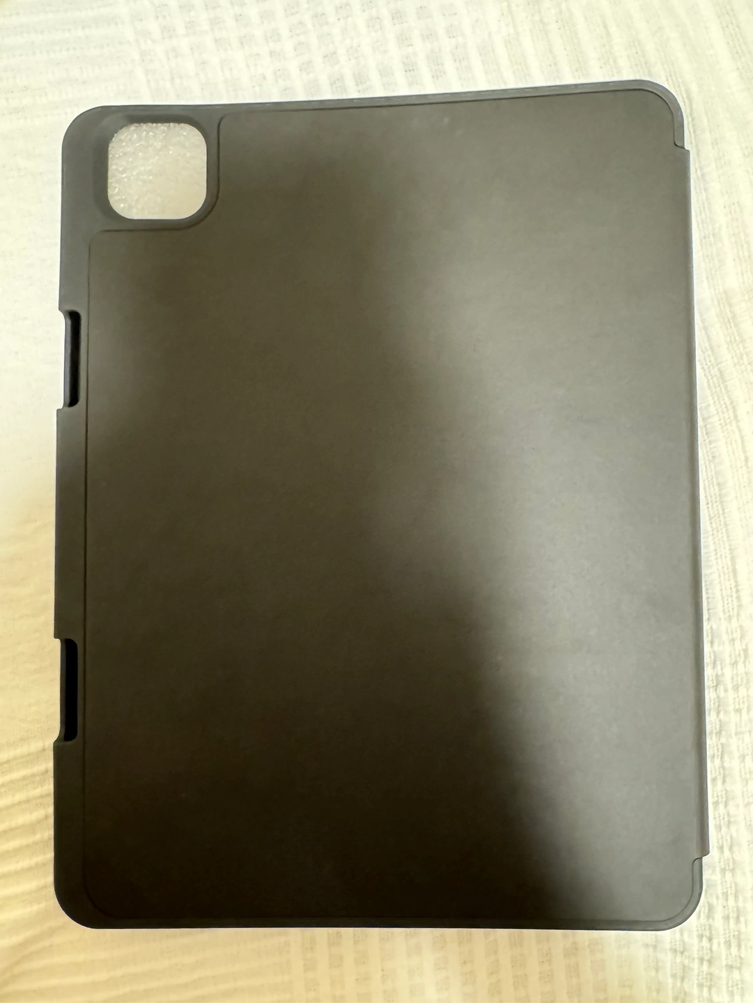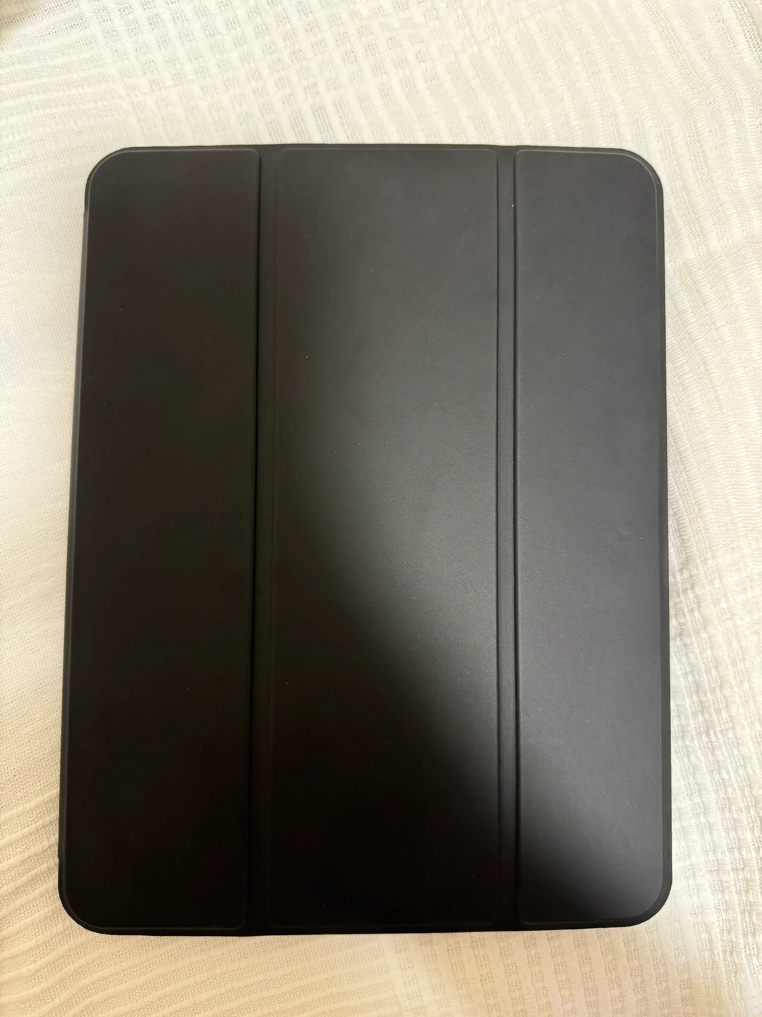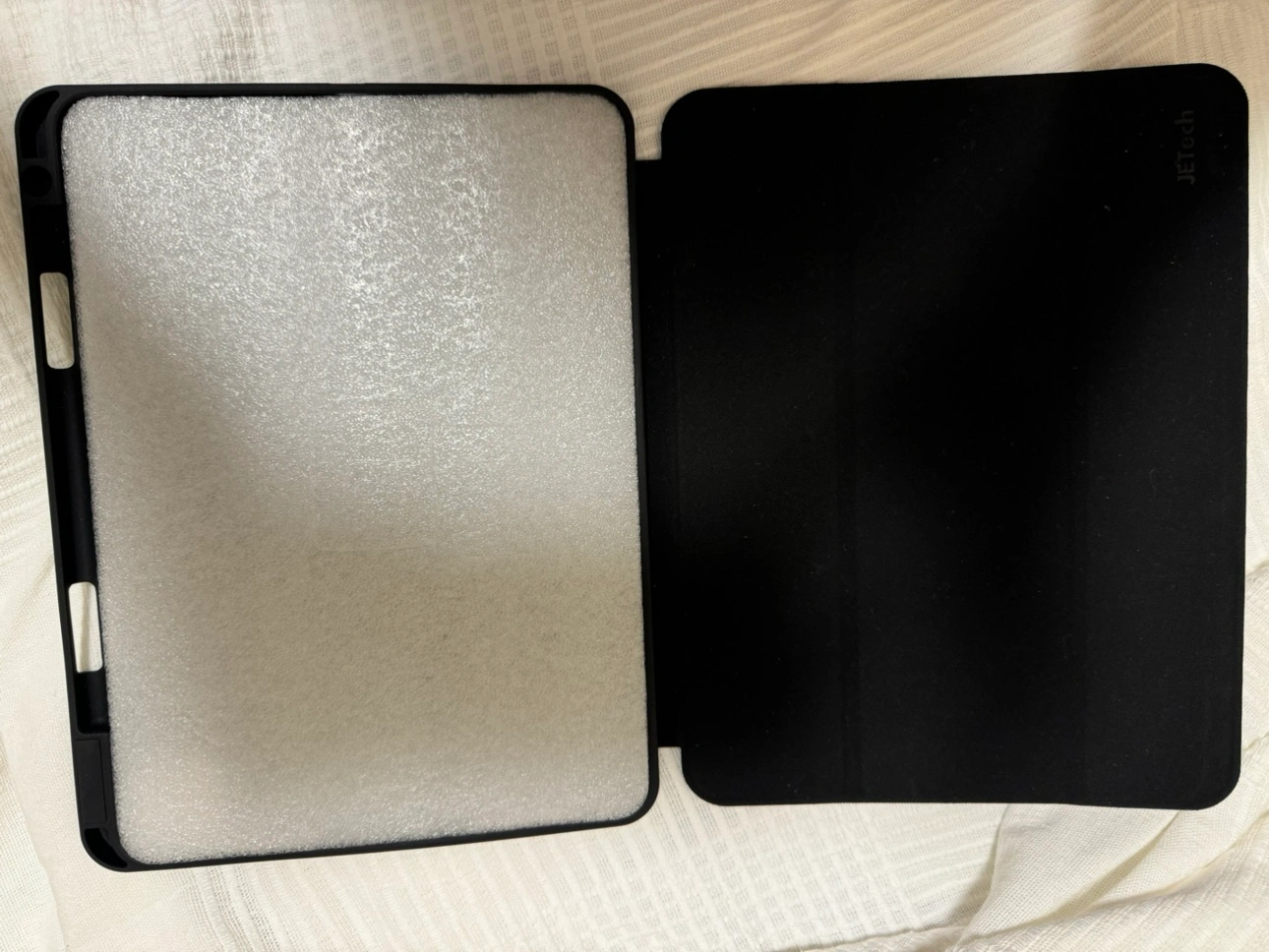 Black iPad case by JETech. The case is made of a hard plastic with a soft inner lining to protect your device. It folds to create a stand.
