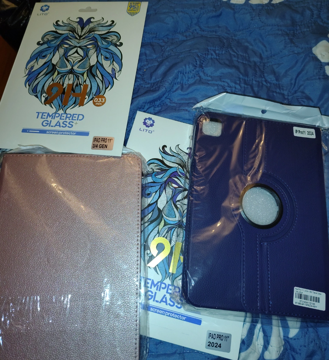 940I'm selling a tempered glass screen protector and case for an iPad Pro 11". - The screen protector is designed for the iPad Pro 11" 3rd/4th generation. - Also included is an iPad Pro 11" 2024 case. $25 each set includes case and protector