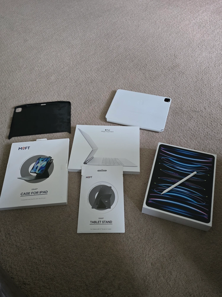 609iPad Pro 12.9-inch (6th Generation) 256GB Wi-Fi model. Includes Magic Keyboard, Apple Pencil 2nd Generation, Moift Snap case, Snap Tablet Stand, Silver colour. Excellent condition. retails well over 2k.