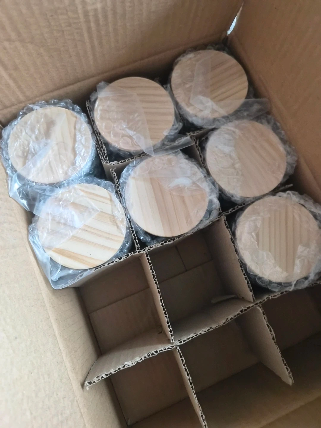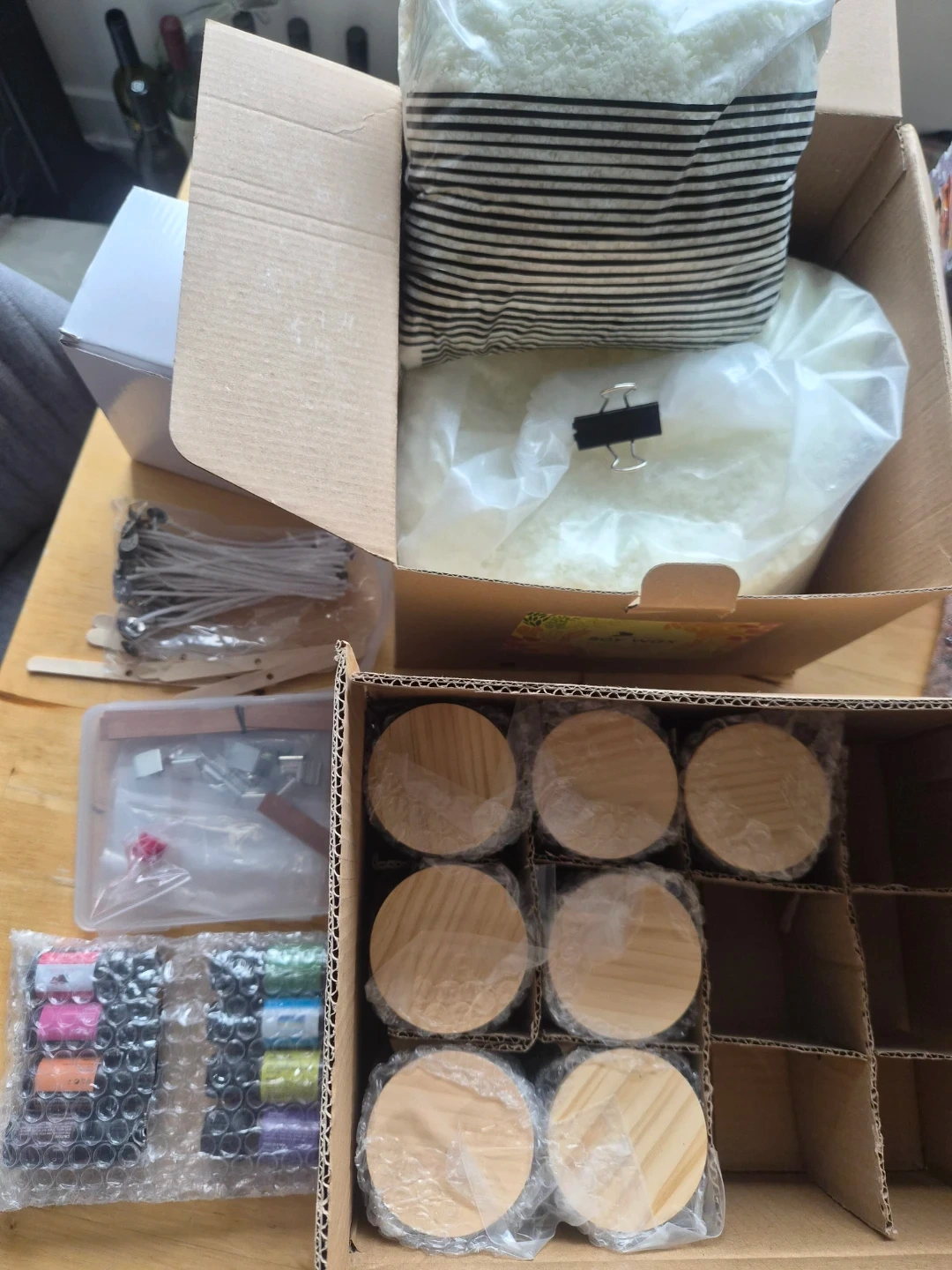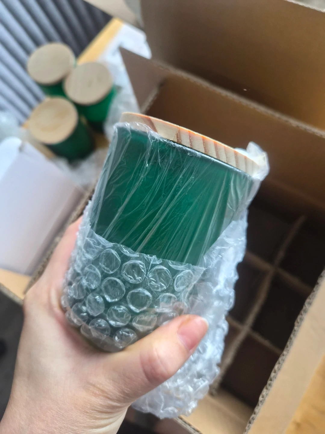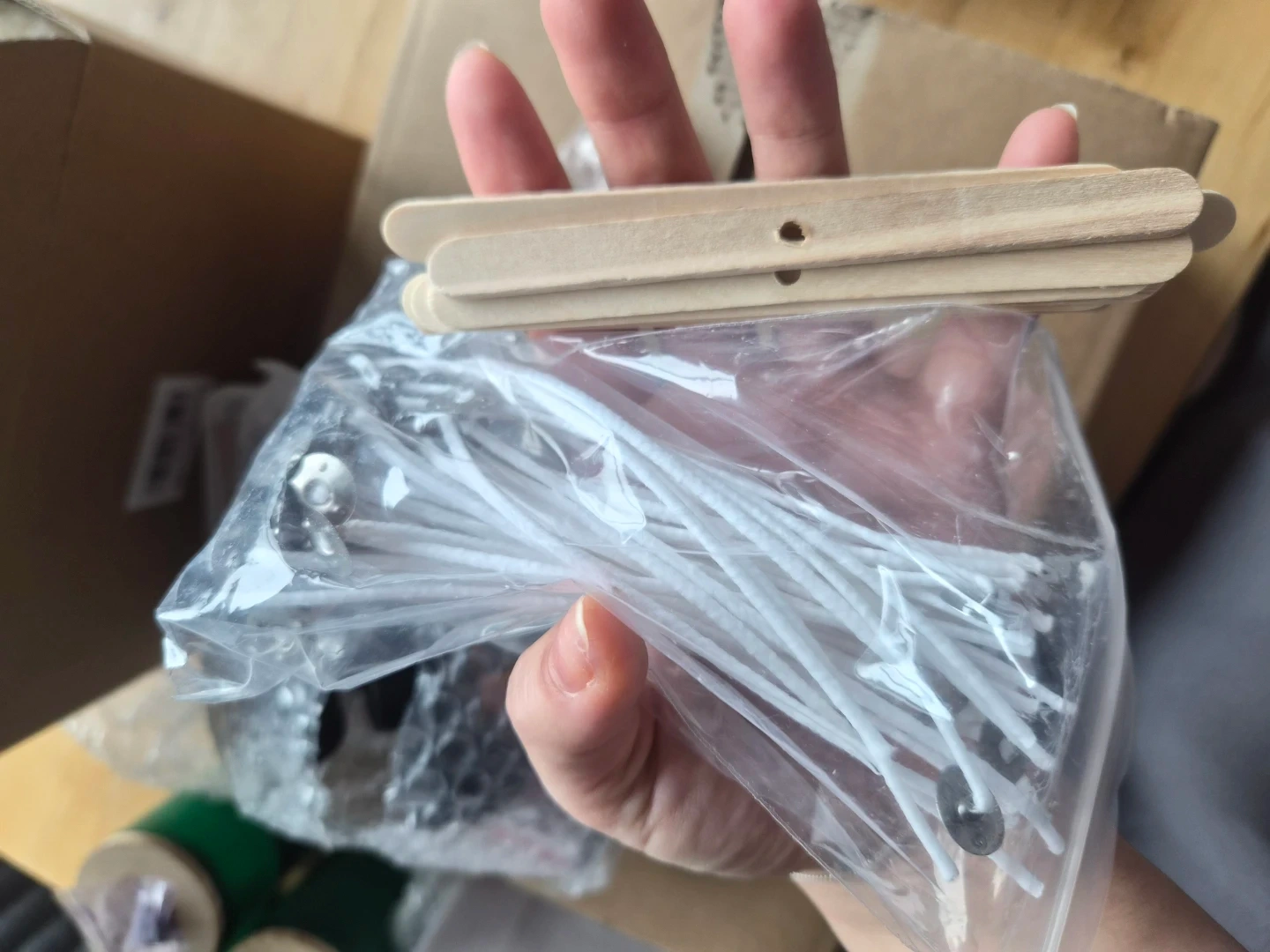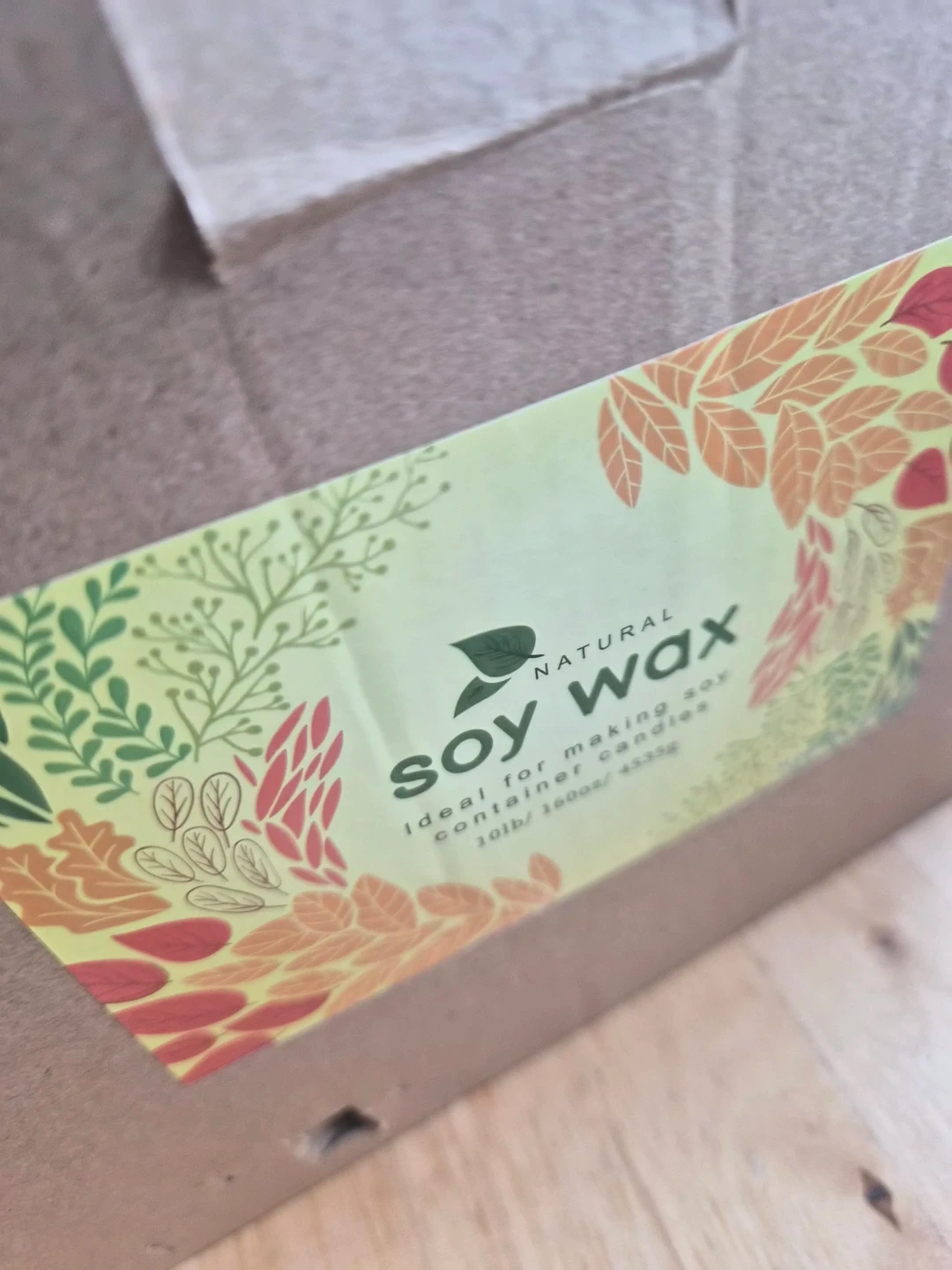 This kit includes natural soy wax (9 lb), ideal for making container candles. It also comes with wooden and clothe wicks, metal clips, and seven green glass jars with wooden lids.