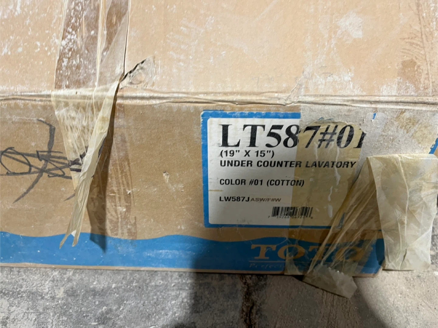 This is a Toto LT587#01 under counter lavatory. It's 19 inches by 15 inches. The colour is Cotton #01. This sink would be useful for a bathroom renovation.