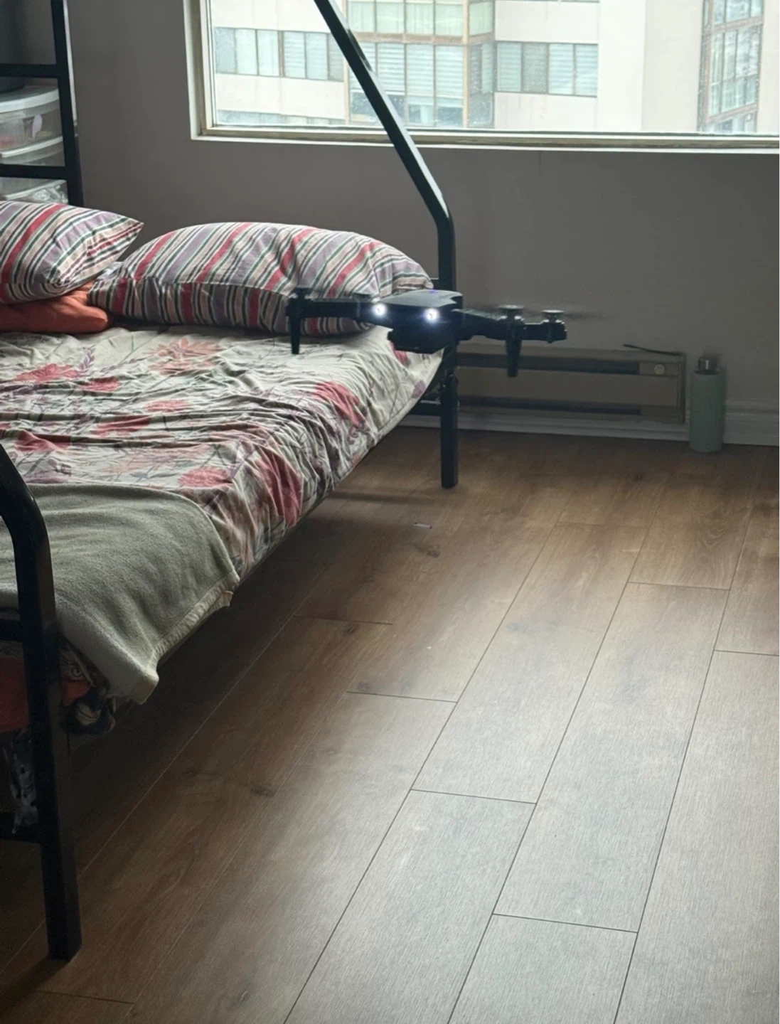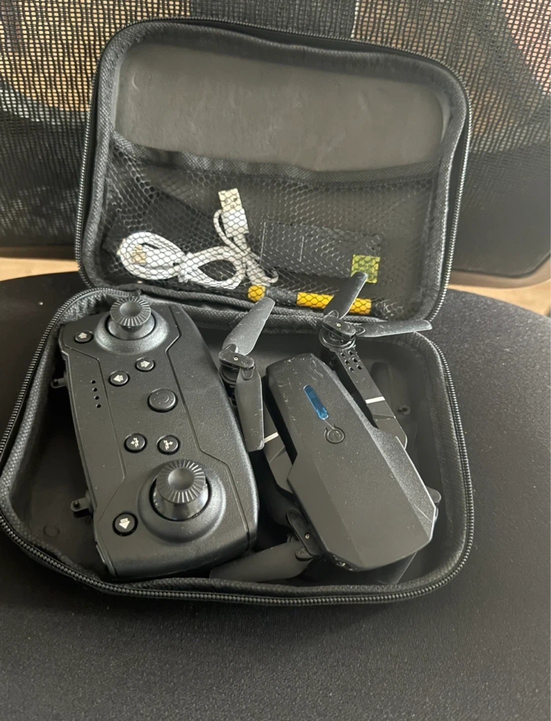 Compact black drone with foldable arms and LED lights. Comes with a remote controller, charging cable, and carrying case. Ready for flight!