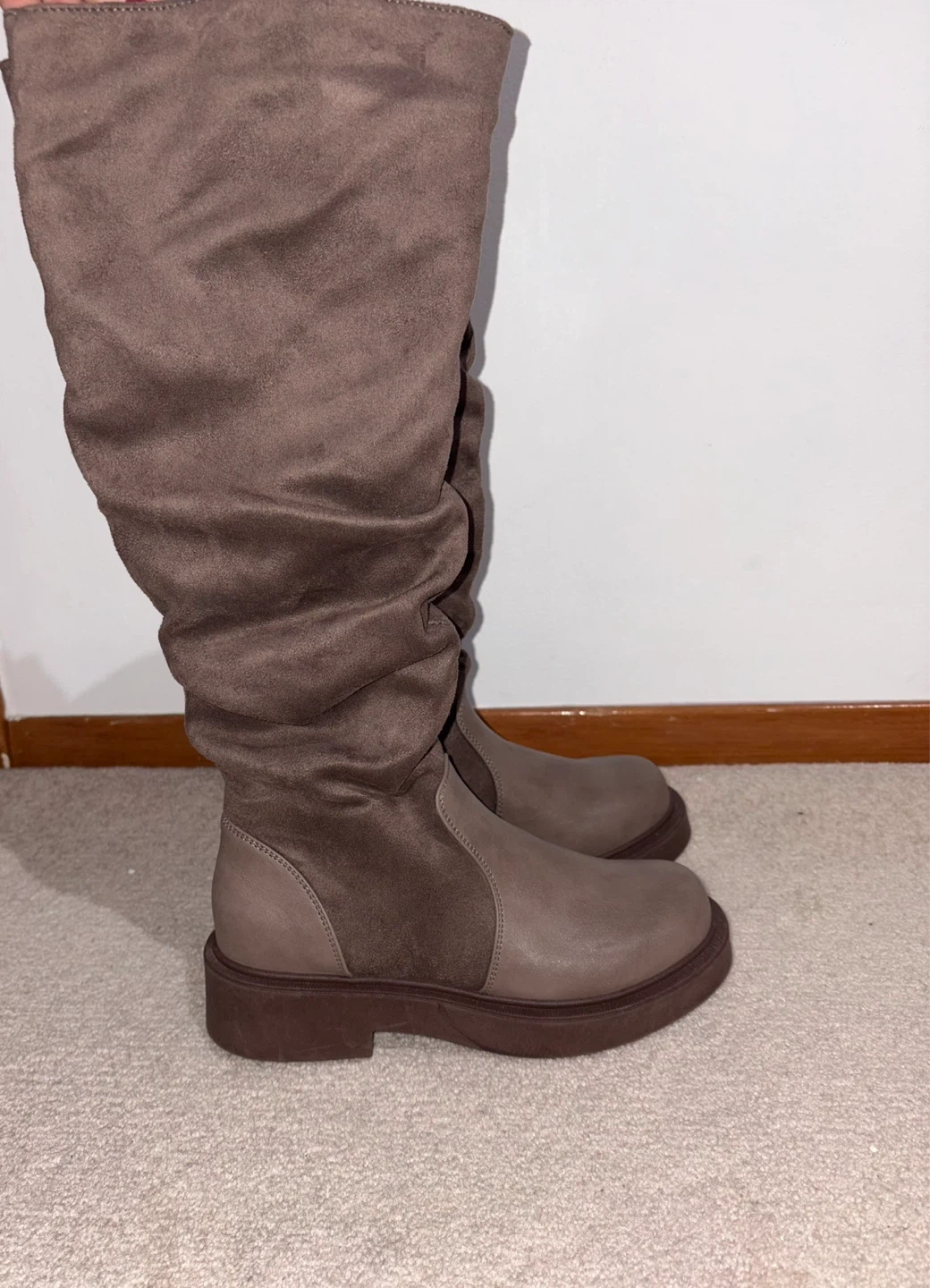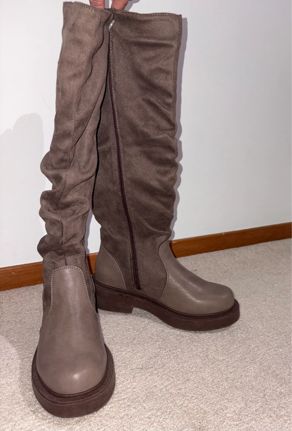 Brown ruched knee-high boots with a zipper closure. Features a faux suede and faux leather upper with a lug sole. Perfect for fall and winter weather!