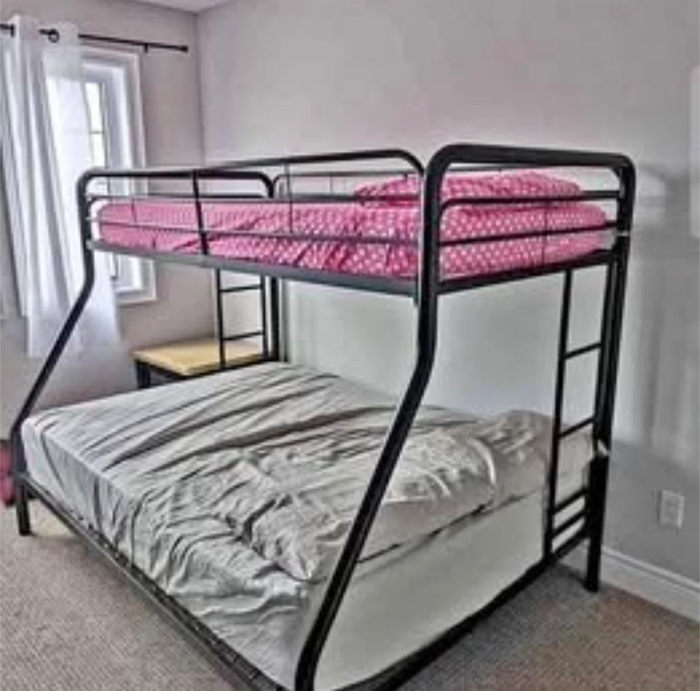 This blue metal bunk bed frame is built for durability. It includes a ladder for easy access to the top bunk. Twin over full configuration provides ample sleeping space. Perfect for maximizing room space!