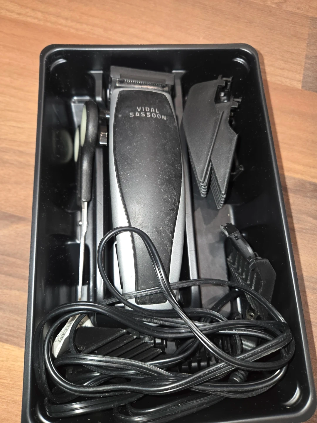 This Vidal Sassoon hair clipper set includes the clipper, multiple guide combs, and scissors. It comes in a storage case for easy organization. The set is ready for your home grooming needs!