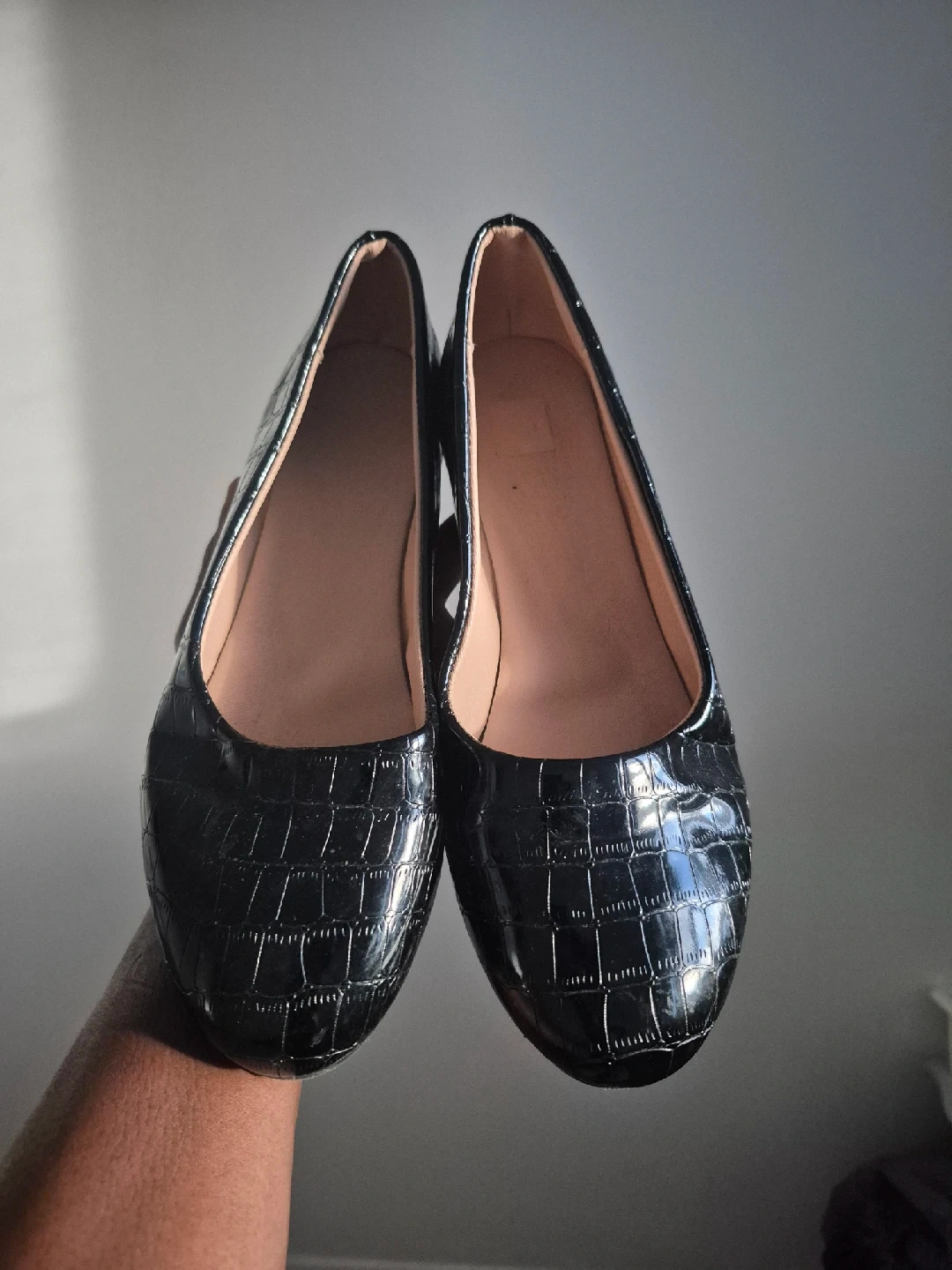 Selling a pair of black flats in size 8US / 40EU. They have a stylish crocodile-like texture and are in good condition.