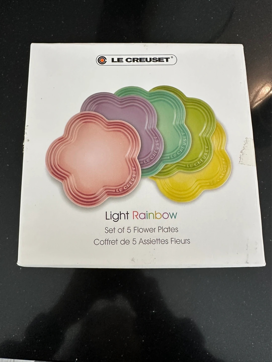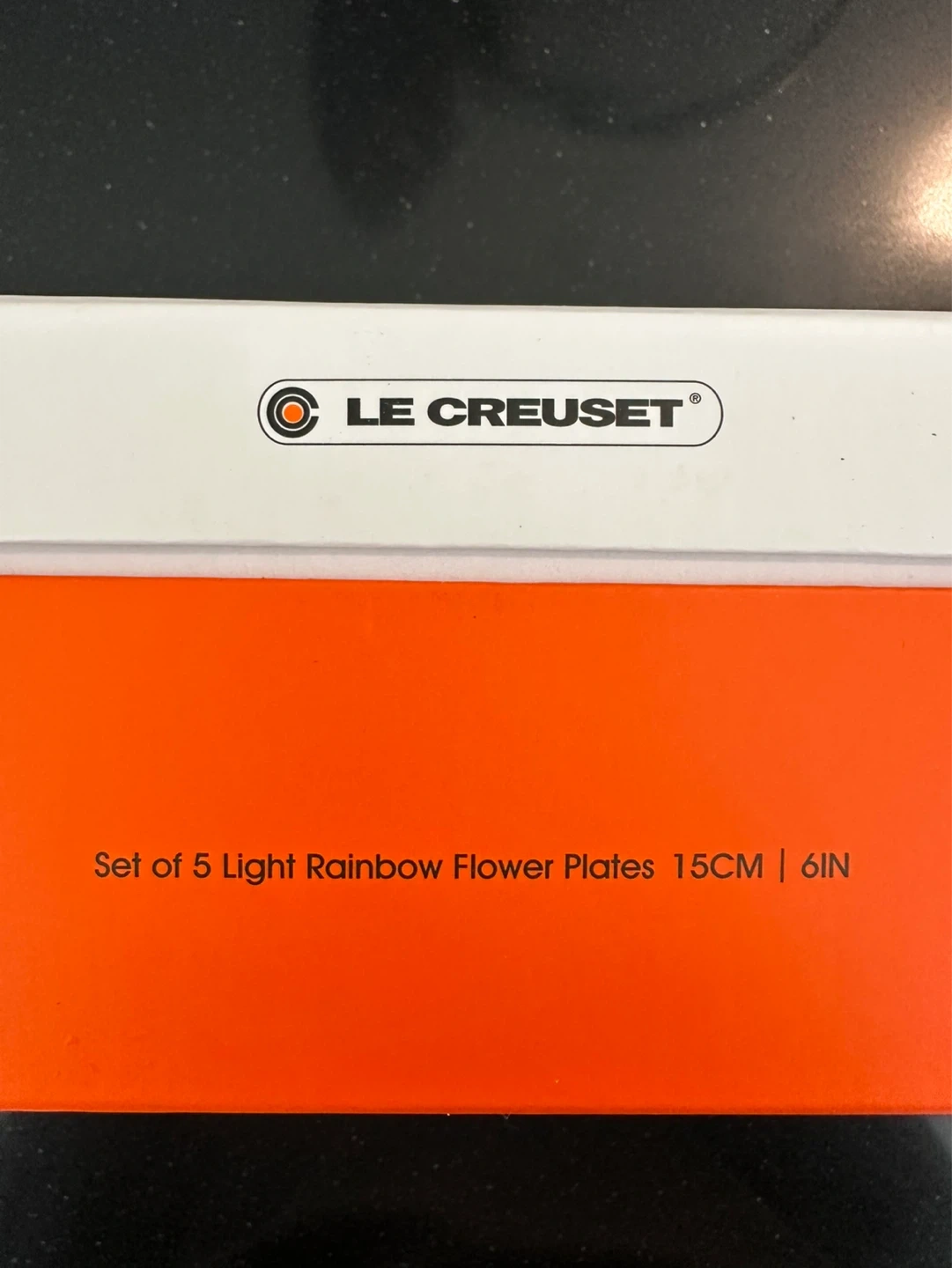 Brand new Le Creuset flower plate set (set of 5) in beautiful pastel colours. Never used, comes with original box. Made of durable stoneware, perfect for serving desserts, snacks, or adding a stylish touch to your table setting. Great for everyday use or special occasions.