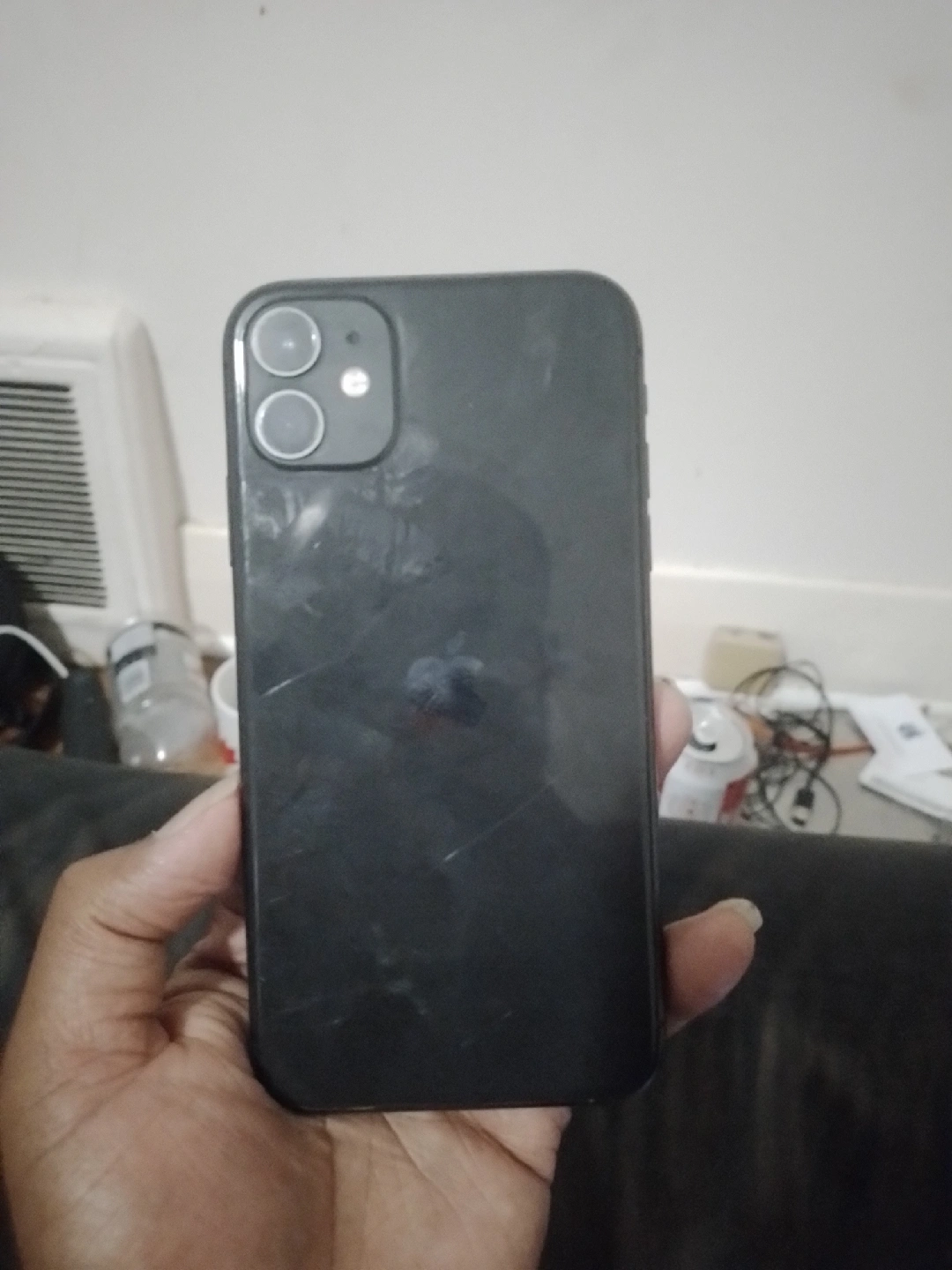 Selling a black iPhone 11. It shows some signs of wear and scratches on the back.
